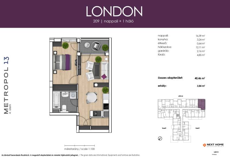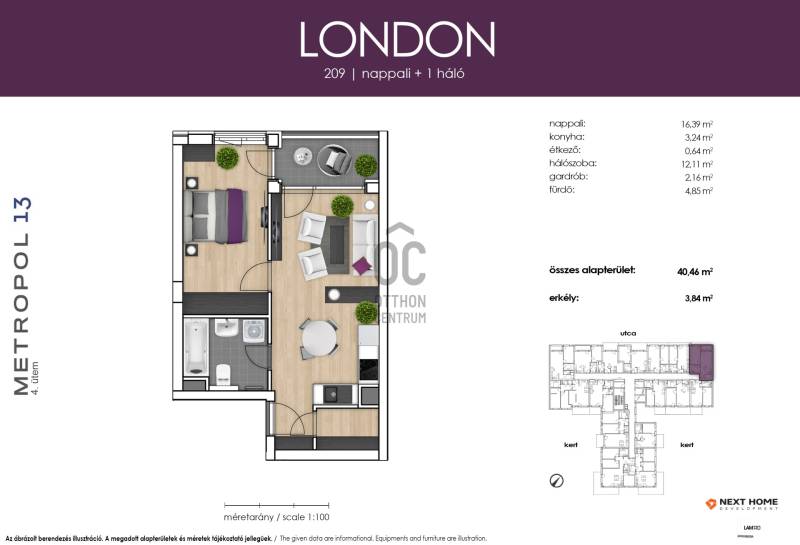 Műszaki átadás 2025 Október. A Metropol 13 lakópark 4. ütemében a XIII. kerület központi helyén, a Westend City Center szomszédságában, a Lehel út és a Lőportárköz közti területen kerül megvalósításra. A kerület ezen részét az elmúlt években megindult fejlesztéseknek és az infrastrukturális fejlődésnek köszönhetően méltán hívhatjuk a fejlődés központjának.Egy modern és minőségi 2 szobás lakás (40,27nm +3,84nm erkély) várja azokat, akik az elegancia és a kényelem kombinációját keresik a West End közelében, Budapest szívében. Az épület új építésű és környezetbarát megoldásokat alkalmazva lett kialakítva, beleértve a hőszivattyú rendszert is, ami környezetbarát és energiatakarékos hűtést-fűtést biztosít.A lakás két szobája bőséges helyet kínál a pihenéshez. Az ablakokon át beáramló természetes fény és a nyugtató kilátás garantáltan kellemes környezetet teremt mindennapi életéhez. A nyugati tájolású használható erkélyen élvezhetjük délutáni naplementét. Az épületben emellett lift is található, ami megkönnyíti a mindennapi teendőket és közlekedést a házban.Ez a lakás tökéletes választás mindazoknak, akik egy modern, minőségi és kényelmes otthont keresnek a városközpontban, de egyúttal értékelik a környezetbarát megoldásokat és a kényelmet a jó közlekedést és a pár percre található Lehel Piacot.ÁrnyékolásA vételár tartalmazza a távirányítós, elektromos aluredőnyöket. Önnek már nem kell foglalkozni az árnyékolással.Mennyezet hűtés-fűtésA legmodernebb hűtési-fűtési rendszer egy sokkal komfortosabb, egyenletesebb hőérzetet biztosít. Zajtalan, légmozgás mentes, magas hűtő- és fűtőteljesítményű rendszer, amely helyiségenként szabályozható, így az eltérő hőigények is megvalósíthatóak. Emelett nagyobb térkihasználhatóságot is biztosít, hiszen nincsenk fűtőtestek a szobákban, hatékonysága pedig az olcsóbb fűtés számlában mutatkozik meg.Zárt, parkosított kertA négy ütemből álló épületegyütteshez összesen 3.000 m2 parkosított kert tartozik majd. A dísznövényes, parkosítot kertek ütemenként megvalósulnak. A társasházak közötti kertek között nincsen átjárhatóság, amely a biztonságérzetet növeli, azonban mégis élvezhetjük az összeépített kertek által nyújtott tágas térérzetet és a kellemes látványt.AA+ minősítésA korszerű szigetelésnek, nyílászáróknak és hőszivattyús hűtési-fűtési rendszernek köszönhetően az épület AA+ energetikai minősítést kap. A jelenleg érvényben lévő 12 fokozatból az AA+ fokozat a 2. helyen áll, amely kiemelkedően nagy energiahatékonyságot jelent, így Ön számíthat rá, hogy számlái alacsonyak maradnak.