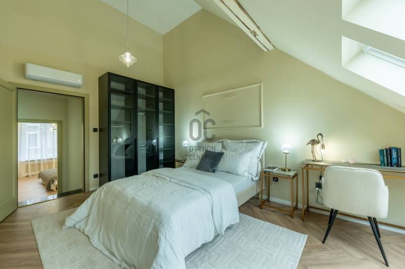 Eladásra kínálok egy kivételes adottságokkal rendelkező,113 m2-es, 4 szobás, 5. emeleti, utcai nézetű, panorámás lakást a belváros szívében, az V. kerületben a Szervita téren!Az ingatlan teljes körűen, magas színvonalon felújított, bútorozott és gépesített, így azonnal költözhető.Lakás jellemzői:Méret: Tulajdoni lap szerint 99 nm, építészmérés alapján hasznos terület 100,6 nm, teljes terület 113m2Elrendezés: Nappali-étkező-konyha egy légtérben, 3 hálószoba, 2 fürdőszoba, külön mosdó, gardróbszoba, közlekedő, saját használatú előtér.Tároló: Az 5. emeleten egy saját, 1,5 nm-es tároló tartozik hozzá.Fekvés és kilátás: Utcai nézetű, panorámás kilátással a Szervita térre.Hangulat: Világos, tágas, központi elhelyezkedése ellenére csendes.Műszaki paraméterek:Teljes körű, magas minőségű felújítás.Nyílászárók: Felújított, hőszigetelt fa ablakok; tetőtéri ablakok motoros, távirányítással működő, felső ponton nyíló kivitelben.Fűtés: Új kondenzációs kazán beépített melegvíztárolóval.Hűtés: Minden hálószoba és a nappali hőszivattyús hűtő-fűtő klímával felszerelt.Hálózatok: Teljesen új elektromos és vízvezeték-rendszer.Burkolatok: Prémium minőségű anyagok.Extrák: Kristály mosdók, motorizált redőnyök, antik ablakrácsok.Egyedi kivitelezés: Fa bejárati és beltéri ajtók, egyedi készítésű konyhabútor, beépített bútorok és kiegészítők.Konyha és fürdő: Technikai kő pultok.Biztonság: Riasztórendszer.Társasház és környék:Épület: Az 1907-ben épült, modernista stílusú társasház homlokzata márványburkolatú, díszszegecsekkel díszített. Eredetileg a Szénássy és Bárczai Áruház működött benne.Ház állapota: Rendezett, liftes épület.Parkolás: Bérelhető parkolóhely az épülettel szemben lévő Szervita Square parkolóban, valamint két közeli mélygarázsban.Egyedi igényekre szabott lakáshitelekkel állunk rendelkezésére. Bankfüggetlen Hitelcentrumunk az országban elérhető összes bank és hitelintézet ajánlatát versenyezteti az Ön számára díjmentesen.Munkatársaink nagy szakmai tapasztalattal várják Önt az előre egyeztetett időpontban akár a normál munkaidő után is.Bővebb információért és a megtekintéssel kapcsolatban hívjon bizalommal!