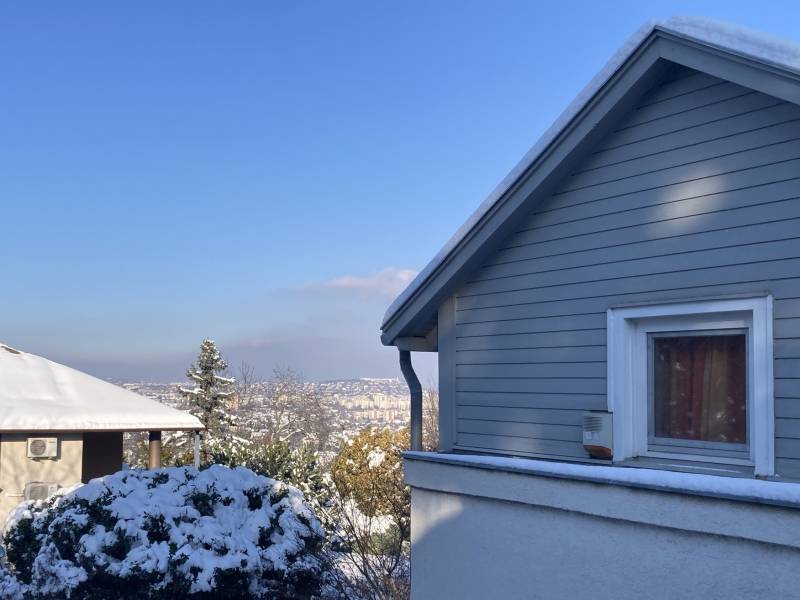 Budafokon, a XI. és a XXII. kerület határán, egy 236 nm lakóterületű, alápincézett, belső két szintes, remek adottságú, korának megfelelő állapotú családi ház eladó dupla garázzsal és intim kerttel.Környék:Budafok XI. kerülettel határos, lankás területén, csendes, kertvárosias, családi házakkal beépített részen járunk.Közlekedés:150B, 251, 251A, 251E buszok megállója fél percnyi sétával elérhető.Kert:Az utca felől a kíváncsi tekintetektől védett, dísznövényekkel, termő gyümölcsfákkal és virágokkal tarkított, gondozott terület övezi az építményt.A kert alatt zöld-tetős, 2 állásos garázs épültÉpület:Az 1993-ban épült, betonfödémes, tégla falazatú házat neves építésziroda tervezte, egyedi belsőépítészeti megoldások jellemzik.Sajátos térformálási és burkolati megoldások, faberakások és az ablakok formai megoldása különleges hangulatot sugároznak. A nyílászárók fa, kétrétegű üvegezésű, hőszigetelt ablakok, redőnnyel.Földszintjén tágas nappali kandallóval, kilátással az óriási teraszra és a kertre, nagy hálószoba, konyha-étkező, kamra és tusoló-wc kapott helyet.Pinceszintjén, melyet a konyhából közelíthetünk meg, zuhanyzó, vízkezelő, finn szauna, kamra, kazán és mosókonyha van.Az emeletről a Szécsényi-hegytől a Citadelláig nyíló panorámát csodálhatjuk. Itt egy előtérből 3 nagy belmagasságú, külön bejáratú szoba és egy fürdőszoba közelíthető meg a galériáról.Az ár alku nélküli végár.