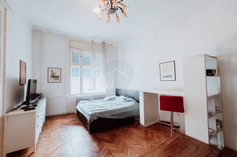 A 4. emeleti, 91 m²-es polgári lakás három külön vizesblokkal (fürdő, WC, mosókonyha) és tágas terekkel rendelkezik.A helyiségek egymásból nyílnak, a kisebb szoba az udvari függőfolyosó mellett található, így második bejárat is kialakítható – lehetőség nyílik két önálló lakás, iroda vagy rendelő létrehozására.Kiváló központi elhelyezkedés, remek közlekedéssel és jelentős átalakítási potenciállal.