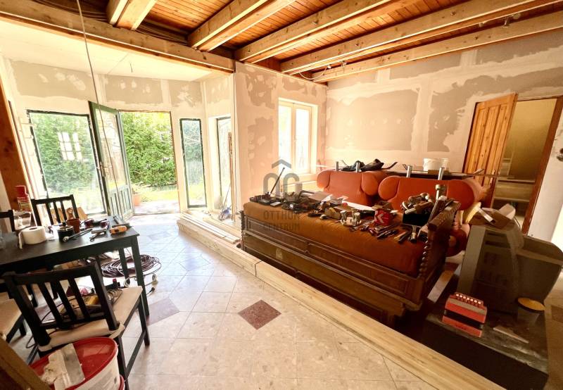 Szentendre kiváló központi részén, a HÉV megállótól 100m-re eladó, egy 1000 m2-es közös telekből ügyédi megosztással leválasztott 620m2 -es saját területen lévő önálló családi ház.A ház 450m2-es amely a pince szinten található garázst/műhelyt, valamint \"irodát\" is magába foglalja. A ház vegyes falazatú, beton alapon áll, falaiban a 15*15cm fa gerendák, a szigetelés és fa lécek, lambéria is a rétegrendet alkotják. Ezen foglal helyet a felújítás részeként rögzítendő gipszkarton. Az emeleti födém fa, és beton anyagú szintén.Az ingatlan, tágas, zöld kerttel rendelkezik, valamint 4-5 felszíni kocsibeálló is található. A családi ház, Szentendre kertvárosi részének egy csendes utcában várja új tulajdonosát. Az épület rendezett állapotban van, 2002-ben épült, jó elosztású, 8 szobás családi ház. Az ingatlanban az emeleten/tetőtérben, akár két külön lakás kialakítására is van lehetőség, mivel két külön villanyórával rendelkező egység található.A korábbi tulajdonos vállalta, hogy a még házon belül szükségszerűen elvégzendő felújtási munkálatokat, mint a teljes fal és álmennyezet gipszkartonozása, glettelése, padlóburkolatok leburkolása, 3 db klíma felszerelését, erkély-korlátot és festést vállalja akár az érdeklődő igényeinek figyelembevétele mellett. Az új tulajdonos egy hangulatos, jól kihasználható otthont kap és alakíthat ki magának. A házhoz tartozik egy fás előkert illetve egy hátsókert is, amely alkalmas lehet virágos udvar, veteményeskert, homokozó, kerti játszótér kialakítására is. A telek medence felállítására alkalmas adottságokkal rendelkezik. Kerti csap és fúrt kút is található rajta.Kialakítás:-Fsz: nappali, hálószoba, hálószoba, hálószoba, konyha, kamra, fürdőszoba-wc, wc, 2db közlekedő, lépcsőház-1.szint/Tetőtér: 1. nappali-konyha, hálószoba, fürdőszoba-wc, közlekedő 2. Nappali-konyha, hálószoba-gardrób, fürdőszoba-wc, erkély-Pinceszint: Iroda: nappali-konyha, öltöző, fürdőszoba; garázs: műhely, wc, kazánházÁllapot:Az ingatlan stabil alapokra épült, ebből kifolyólag repedés, süllyedés nem észlelhető.Jelenlegi állapotában is költözhető, műszaki és esztétikai felújítás lehetséges.-A nyílászárók épek, több rétegű fábol készült ablakok-Vizesedés, penészedés sehol sem tapasztalhatóA házról:- Déli tájolás- 8 db külön nyíló lakószoba- 3*16 Amper áram- 265 cm belmagasság, garázs szinten 3m feletti- világos, tágas belső terek, - földszinten viacolor borítású terasz és fa bejárati ajtó, a hátsó kertre pedig két hátsó kijárat is vezet. Fent szintén viacolor erkély.- konyhában oda illő konyhabútor, fürdőszobákban kád és törölközőszárító is.- kellemes, kertre, valamint utcai zöld környezetre néző ablakokMűhely:- autószereléssel kapcsolatos teljes berendezés, eszközök, gépek: emelő, akna, alváz-mosó, futómű állító stb.- fűtött, és a bejárati rámpa isKözművek:-Víz, villany, gáz, csatorna bekötve-Fűtése: gázkazán, radiátor+padlófűtés-kertben kerti csap + fúrt kút (karbantartása aktuális)Elhelyezkedés:-Ingyenes utcai parkolás-Közlekedés szempontjából kiváló: H5 Hév végállomás közelében, 890-es Budapestre közlekedő busz-Közelben: 1 percre Spar, P+R parkoló, szolgáltatások, posta, gyógyszertár, játszótér, iskola, benzinkútAz ingatlanon 12M Ft értékű jelzálog található, amely birtokbaadásig természetesen rendezésre kerül.A ház családok számára tökéletes otthon, de befektetés szempontjából is értékálló, gyorsan kiadható hosszútávra is akár.*Az alaprajz még az eredeti, tájékoztató jellegű, a ház elosztása változott a hirdetésben felsoroltak szerint, így az még feltöltés alatt van!Az ingatlan megvásárlásához jelzáloghitel, CSOK (+), Babaváró is igénybe vehető, melynek ügyintézésében közvetlenül tudunk segítséget nyújtani.Ha felkeltette az ingatlan az érdeklődését és szívesen lenne új lakója ennek a kedves és korrekt tulajdonos birtokában lévő lakásnak, úgy forduljon hozzám maximális bizalommal és mindenben segítek.