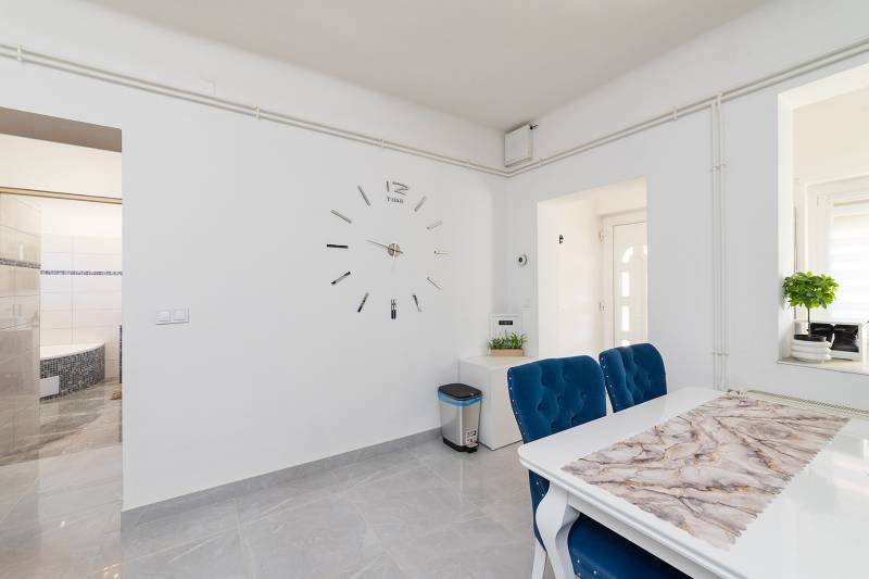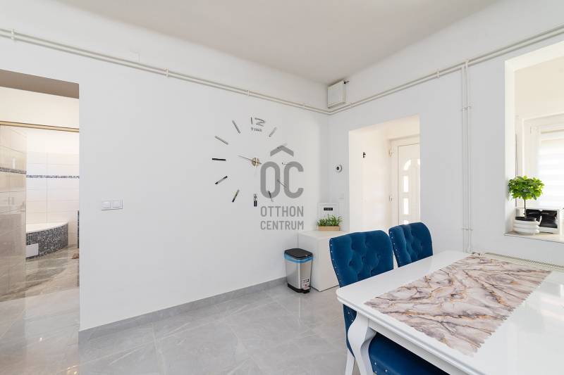 Dányban kínálunk megvásárlásra egy gyönyörűen felújított, földszintes önálló családi házat 1230 nm-es telekkel, kerti tóval, sütögetővel, hatalmas fedett terasszal, két autó számára fedett beállóval. A ház az utóbbi években műszakilag és esztétikailag fel lett újítva, komplett tető csere 2024-ben, fűtés korszerűsítés (kondenzációs kazán), elektromos hálózat, vízcsövek,. lefolyó csövek is cserélve lettek. Továbbá a nyílászárók, konyha, fürdőszoba, szaniterek és burkolatok is megújultak. Modern, esztétikus belső design jellemzi a házat. A nagy, fedett teraszról nyílik a bejárat, itt található egy előszoba pakolási lehetőséggel, majd a modern bútorral és gépekkel felszerelt konyha-étkező, kamra (alatta pince), egy szép zuhanyzós és kádas fürdőszoba, nagy hálószoba, teraszkapcsolatos nappali és még egy hálószoba, mely befejezésre vár (festés és burkolás van hátra, igény esetén a tulajdonos befejezi külön megállapodás alapján). A ház első része vegyes falazat, szigetelt alappal, a további részek tégla építésűek. A tégla részeken 20 cm dryvit szigetelés van, A tetőt Tondach cserép fedi. A teljes bútorzat a vételár részét képezi, tehermentes ingatlan, rövid időn belül birtokba vehető.