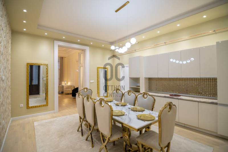 Kiadó luxus polgári lakás az Andrássy úton!Az Andrássy út eleganciáját és történelmi hangulatát ötvözi ez a 160 m²-es, 4 szobás, teljes körűen felújított, napfényben úszó polgári lakás, amely a klasszikus értékeket és a modern kényelmet egyaránt képviseli. Az 1. emeleten elhelyezkedő ingatlan tágas nappalival és 3 hálószobával rendelkezik, belmagassága eléri a 4 métert, amit a gyönyörű gipszstukkók és a spalettás polgári ablakok tesznek igazán impozánssá.A lakás utcai nézetének köszönhetően világos és napos, a hozzá tartozó TERASZ pedig különleges ritkaság a környéken. A belső terek teljesen berendezve, modern és stílusos bútorokkal várják új bérlőjüket, a konyha és a fürdőszoba minden szükséges géppel felszerelt. A lakás műszaki tartalma is a kényelmet szolgálja: gázcirkó fűtés és klímaberendezés gondoskodik az optimális hőmérsékletről.A társasház , lifttel rendelkezik, a belső udvarban pedig PARKOLÁSI LEHETŐSÉG biztosított.A lakás minden részlete új, így a bérlő egy elegáns, kifogástalan állapotú otthonba költözhet be azonnal.Az épület a főváros egyik ikonikus, reprezentatív palotája, amely a 19. század végén épült a sugárút fénykorában. A ház homlokzatát gazdag díszítés, elegáns arányok és impozáns ablakok jellemzik, belső terei a klasszikus polgári hangulatot idézik. Az Andrássy út központi elhelyezkedése miatt a ház közvetlen közelében megtalálhatók a város legnívósabb éttermei, kávézói, divatházai és kulturális intézményei, így az itt bérelhető lakás nem csupán otthon, hanem igazi életstílus is.Számos Éttermek és kávézók: Művész kávéház, Callas Café & Restaurant,Bombay Curry Bar,Hoppá! Bistro,Nem utolsó sorban az OPERA pár perc séta távolságban.A lokáció kiemelkedő: a belvárosi környezet egyszerre nyugodt és pezsgő, kiváló közlekedési lehetőségek: M1, Busz 105, 210, Deák Tér Reptéri Busz 100E, és villamosmegállók (4,6 pár perc sétára.Bővebb információért és a megtekintéssel kapcsolatban hívjon bizalommal!