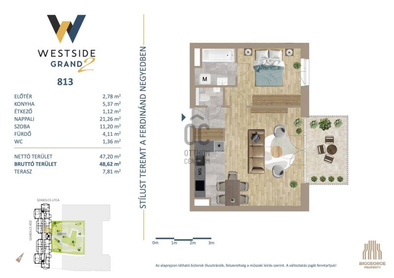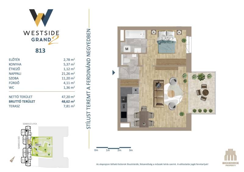 Projekt bemutatásaA projektrőlA Westside Grand I-II. a Biggeorge Property Westside fejlesztés sorozatának - a Westside Residence és a Westside Gardent követően - legújabb tagja.LokációBudapest egyik leggyorsabban fejlődő kerületének központi területén, a XIII. kerületben, a Városligettől és a megújuló Nyugati pályaudvartól sétatávolságra épül. A Nyugati pályaudvar környéke az elkövetkezendő években szinte teljesen megújul, a XIII. kerületben elhelyezkedő Szabolcs utcában, illetve közvetlen környezetében számos új építésű ingatlan épült, melyek jelentős értéknövekedést kínálnak a környéken ingatlant vásárlóknak. A több ütemben megvalósuló lakóingatlanfejlesztések hatalmas zöld parkot ölelnek körül, így a lakók akár az erkélyen ülve is élvezhetik a csendet, nyugalmat és zöld környezetet egy központi, belvárosi környezetben is.