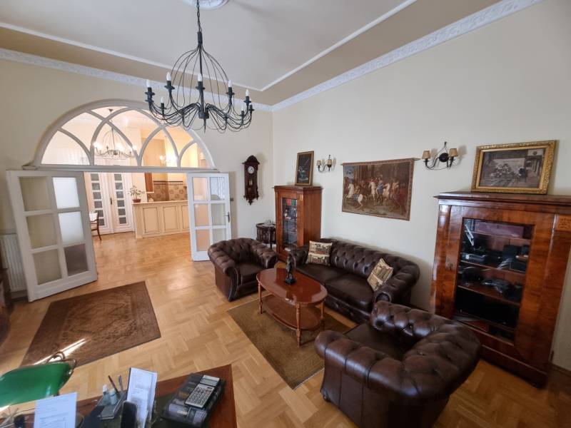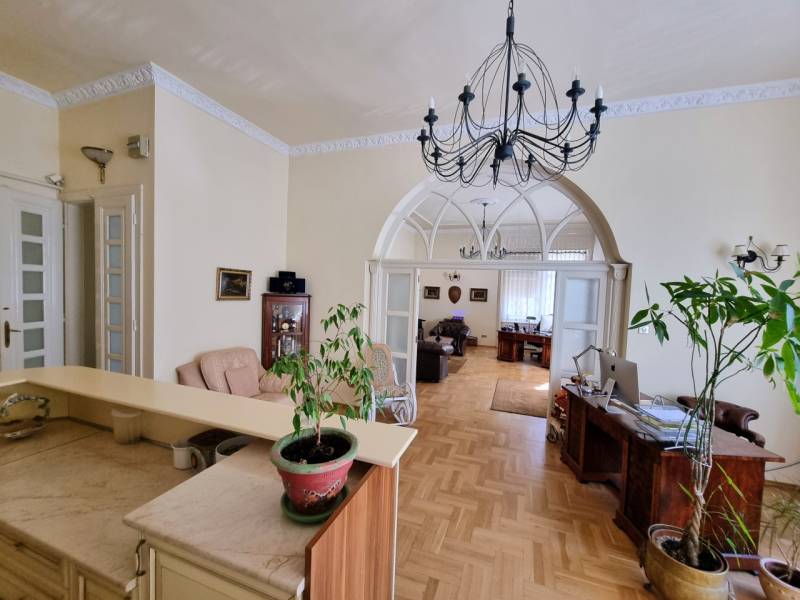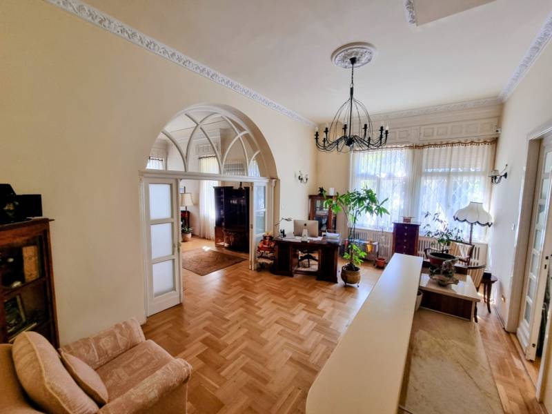 Újdonság az ingatlanpiacon, Herminamezőn, platánfák árnyékában megbújó ingatlanunk került eladósorba!A közkedvelt Amerikai úthoz közel,1918- ban épült villa épület magasföldszintjén helyezkedik el, (alaprajzon zölddel körbe jelölve látható). A ház historizáló - eklektikus stílusban épült, az építész annak idején a házat saját magának tervezte, napjainkban folyamatosan karbantartott, állapot megőrzése, illetve javítása érdekében a társasház folyamatosan törődik vele, pályázatokon indul!Egyik különlegessége, hogy a társasházba egy tekintélyes 33 nm-es külső teraszról jutunk be, majd az ingatlant egy zárt lépcsőházból közelíthetjük meg, ami a szomszéd ingatlannal kizárólagos használatban van, (a szomszéd 85 nm-es lakás szintén eladó és a kínálatunkban megtekinthető) Az ingatlan az elmúl években irodaként funkcionált, de a belső tér kialakítása alkalmassá teszi lakásként való használatra is, amerikai konyhás nappali +2 vagy kis átalakítással 3 hálószoba állhat rendelkezésre.Bejáratnál továbbhaladva rögtön megnyílik előttünk a tér, a ragyogóan napfényes nappalis konyhába érkezünk meg, valamint innen elérhető egy vendég wc, tágas dolgozó/háló aminek egy hangulatos kertre néző félkör erkélye is van, valamint helyet kapott egy külön háló és egy zuhanyzóval beépített tágas fürdőszoba is.Fűtése önnáló gáz církó, tájolása d-dnyi ezért napos, világos, klímával felszerelt, rezsije alacsony gáz és az elektromos áram költsége átlag: 20.500 ft/hó. Állapotát tekintve igényes, rendezett, a fotón látható bútorok igény esetén külön megegyezés alapján megvásárolhatóak.Parkolásra egy autónak 13,5 nm-es garázs áll rendelkezésre, ára 10 mft, amit a vételár nem tartalmaz. További tároló a pince szinten rendelkezésre áll.Remek lokációnak köszönhetően egyaránt ajánlom családosoknak, vagy vállalkozóknak is, hiszen egyaránt kiválló lakni, vagy irodai használat céljából is. A közvetlen közelben megtalálható tömegközlekedés, bevásárlási lehetőség, iskola, óvoda stb.Időpont egyeztetésés alapján megtekinthető!