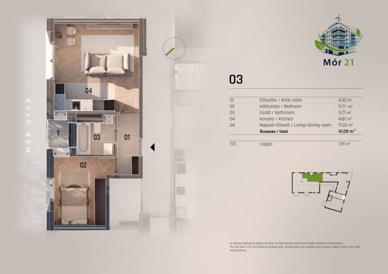 Projekt bemutatásaA Mór utca és Dévényi utca sarkán, egy hangulatos saroktelken épül fel ez a 23 lakásos, modern megjelenésű, mégis a környezetébe harmonikusan illeszkedő társasház. A kivitelezés során kiemelt figyelmet kapott a benapozás, a jól élhető terek kialakítása, valamint a magas műszaki tartalom.Az épület földszint + 5 emelet kialakítású, pinceszinttel, ahol teremgarázs és tárolók is helyet kaptak. Minden szinten ergonomikusan megtervezett, kiváló elosztású lakások találhatók, jellemzően 42–90 m² közötti alapterülettel. A legtöbb lakáshoz saját loggia, erkély vagy terasz tartozik – a felső szinten exkluzív nagy teraszos lakások kerültek kialakításra.A társasház minden szempontból megfelel a mai kor elvárásainak:– 23 parkolóhely (12 a pinceszinten, 11 a földszinten), Elektromos autó töltési lehetőséggel– 6 tároló,– zöldtető és közösségi tetőkert,– geotermikus hőszivattyús fűtés és hűtés,– padlófűtés, fan-coil hűtés,– háromrétegű nyílászárók, korszerű hő- és hangszigetelés,– liftes megközelítés minden szinten.Az épület anyaghasználata prémium minőségű: terrakotta árnyalatú burkolólapok, világosszürke betonhatású elemek és szignálfehér falfelületek teszik igazán különlegessé a házat.A kiváló infrastruktúrájú környék – Jász utca, Lehel út, Róbert Károly körút, M3-as közelsége – garantálja a gyors közlekedést, míg a környező parkok, új fejlesztések és szolgáltatások emelik a lakók életminőségét.Ez a projekt ideális választás lehet városi otthont keresőknek, tudatos befektetőknek és azoknak, akik értékelik a magas minőséget és az élhető, modern lakókörnyezetet.