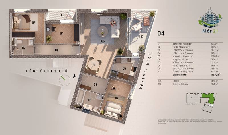 Projekt bemutatásaA Mór utca és Dévényi utca sarkán, egy hangulatos saroktelken épül fel ez a 23 lakásos, modern megjelenésű, mégis a környezetébe harmonikusan illeszkedő társasház. A kivitelezés során kiemelt figyelmet kapott a benapozás, a jól élhető terek kialakítása, valamint a magas műszaki tartalom.Az épület földszint + 5 emelet kialakítású, pinceszinttel, ahol teremgarázs és tárolók is helyet kaptak. Minden szinten ergonomikusan megtervezett, kiváló elosztású lakások találhatók, jellemzően 42–90 m² közötti alapterülettel. A legtöbb lakáshoz saját loggia, erkély vagy terasz tartozik – a felső szinten exkluzív nagy teraszos lakások kerültek kialakításra.A társasház minden szempontból megfelel a mai kor elvárásainak:– 23 parkolóhely (12 a pinceszinten, 11 a földszinten), Elektromos autó töltési lehetőséggel– 6 tároló,– zöldtető és közösségi tetőkert,– geotermikus hőszivattyús fűtés és hűtés,– padlófűtés, fan-coil hűtés,– háromrétegű nyílászárók, korszerű hő- és hangszigetelés,– liftes megközelítés minden szinten.Az épület anyaghasználata prémium minőségű: terrakotta árnyalatú burkolólapok, világosszürke betonhatású elemek és szignálfehér falfelületek teszik igazán különlegessé a házat.A kiváló infrastruktúrájú környék – Jász utca, Lehel út, Róbert Károly körút, M3-as közelsége – garantálja a gyors közlekedést, míg a környező parkok, új fejlesztések és szolgáltatások emelik a lakók életminőségét.Ez a projekt ideális választás lehet városi otthont keresőknek, tudatos befektetőknek és azoknak, akik értékelik a magas minőséget és az élhető, modern lakókörnyezetet.