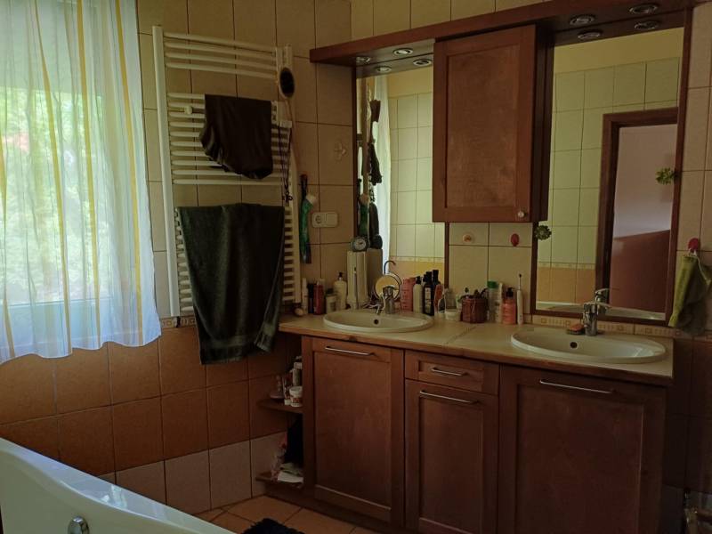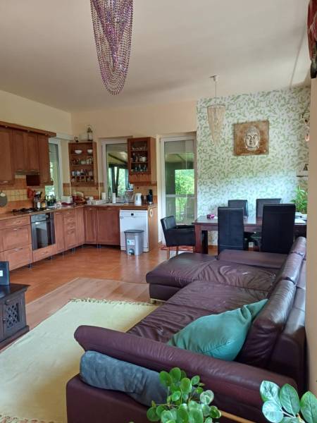 Csodálatos kert, egyedi stílus a Pilis szívében!Eladó Pilisvörösvártól nem messze, Piliscsaba Garancsligeti részén, nyugodt környezetben található egy 1119 m²-es, gyönyörű kerttel rendelkező, kétszintes családi ház.Az ingatlan 2008-ban épült, 38-as téglafalazattal és külső, 15 cm vastag hőszigeteléssel.Belső kialakítása egyedi:-felső szinten (95 nm): előtér, 3 szoba, fürdőszoba, WC, gardrób rész, egy kis szintkülönbséggel tágas nappali+konyha+étkező teraszkapcsolattal és egy télikerttel, lépcsőlejáró az alsó szintre-szuterénszinten: fűthető garázs, szauna zuhanyzóval, mosdóval, fedett kocsibeálló.A fűtés gázkazánnal működik, hidegburkolatos részeken padlófűtéssel.Az utcafronti- és garázskapu elektromos.Az egész telek telis-tele van gyönyörű növényekkel (gyertyán, galagonya, ringló, tiszafa, hársfa, ginkgo, füge, cseresznye-, meggyfa, vérszilva, színes virágok, stb. :)). Még gyógynövényes rész is helyett kapott a kertben. Hangulatos kis kiülős részek vannak az érett növényzet között. :)Ez a ház és kert egy igazi csoda, ha szereti a különleges hangulatot! :)Budapest kb. 40 perc vonattal.A közelben számos kirándulási lehetőség.Ha további kérdése lenne vagy megtekintené az ingatlant, kérem hívjon!Őri Klaudia 20/253-2522