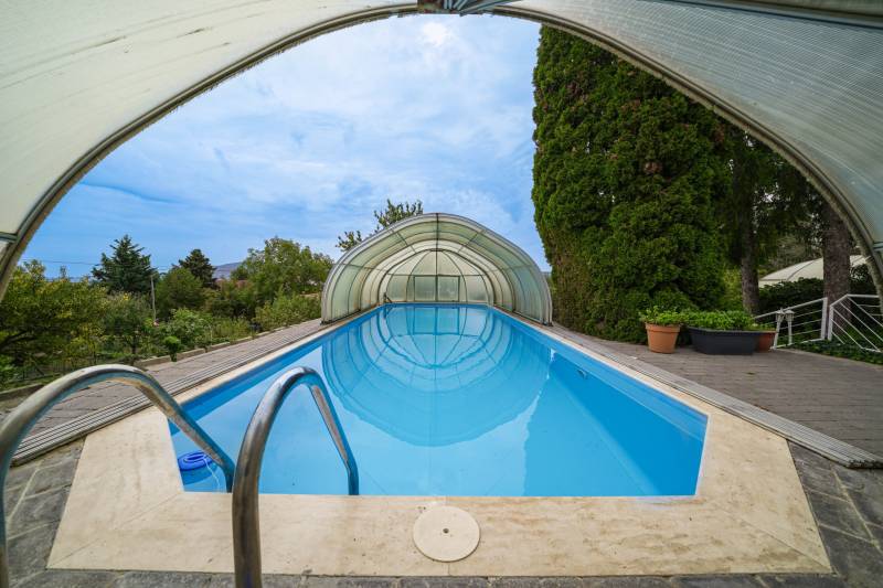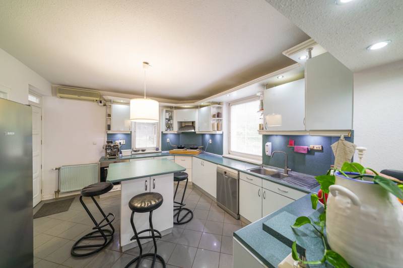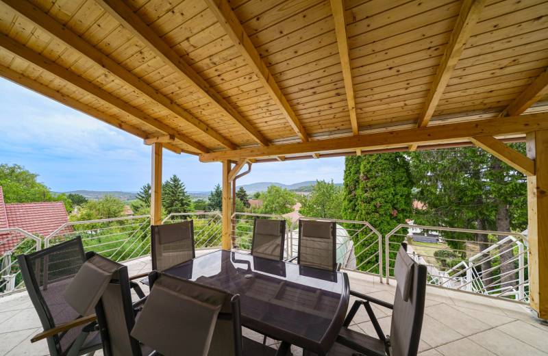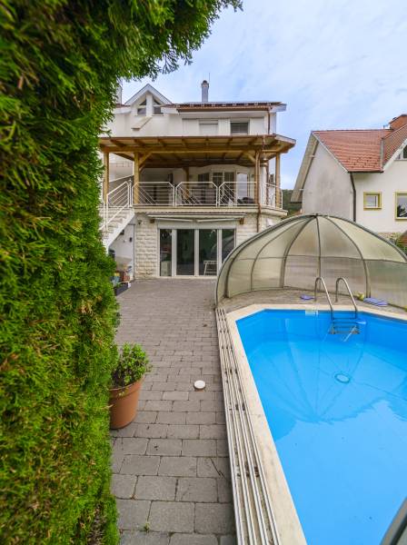 Eladó egy különleges, négy szintes családi ház páratlan környezetben, természetvédelmi terület szomszédságában, 1000 m²-es telken!Ha tágas, kényelmes és fenntartható otthont keresel, ahol a nyugalom, a friss levegő és a panoráma egyszerre adott, akkor ez a ház neked való!Főbb jellemzők:375 m² főépület + 35 m² garázsFedett medence hőszivattyús fűtésselZárt garázs két autóra (EV-töltővel) + fedett kocsibeálló6 nagyobb és 2 kisebb hálószobaTágas amerikai konyhás nappali étkezővelMinden szinten wc/mosdóKlíma minden helyiségbenÓriási fedett terasz lenyűgöző panorámávalTeljes UTP-hálózat szobánként, központi szerverhez bekötveNapelem rendszer (12,8 kWh) + hőszivattyús fűtés → rezsimentes működés (EV-töltés is beleértve)Háromfázisú elektromos hálózat (3×32A)Gáz bekötve, használaton kívül.Környezet és elhelyezkedés:A ház nyugodt, zöldövezeti faluban található, ahol minden fontos intézmény helyben elérhető: bolt, gyógyszertár, orvosi rendelő, iskola, óvoda, buszmegálló és még kávézó is.