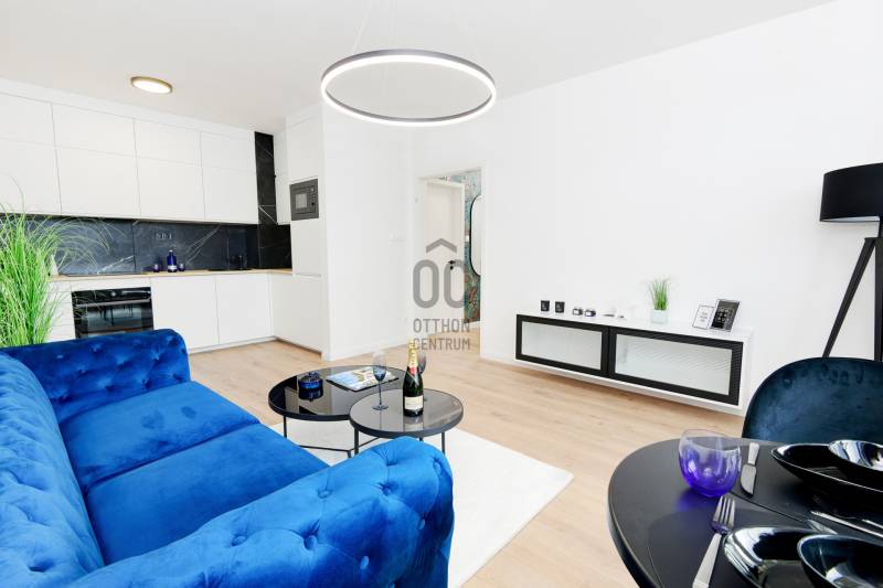 AZONNAL KÖLTÖZHETŐ újszerű 2 szobás erkélyes lakás a Göncz Árpád városközpontnál.A FÉNYKÉPEK A VALÓSÁGOT ÁBRÁZOLJÁK, NEM LÁTVÁNYTERVEK!A társasház kiváló minőségben épült, gyönyörűen gondozott belső kert, 24 órás portaszolgálat, mészkő borítású homlokzat.Az ingatlanok házközponti fűtéssel rendelkeznek egyedi méréssel, több pontos biztonsági ajtóval felszereltek.A lakás délnyugati tájolású, a hatalmas üvegfelületeken árad be a napfény.A felújítás és a berendezés frissen készült el, minőségi anyagok felhasználásával.A konyhabútor matt fehér és matt fekete színei modern és elegáns megjelenést adnak, teljesen gépesített, indukciós főzőlap, sütő, mosogatógép, beépített hűtő, mikró.Az ingatlan ízlésesen berendezett, a bútorok is megvásárolhatóak.A lakáshoz vásárolható teremgarázs hely és egy tároló is.A környék infrastruktúrája kiváló, újépítésű társasházak környezete és kellemes lakóközösség fogadja az ide költözőket.Számtalan tömegközlekedési eszköz, M3 metróvonal 1-es villamos 950, 950A, 901, 918, 34, 106 - os buszok, 75 , 79 - es troli. Élelmiszerboltok, Pizzázó, Rétesbolt, végtelen lehetőség.A lakás rugalmasan megtekinthető, frissen berendezett Ön lehet az első lakója.
