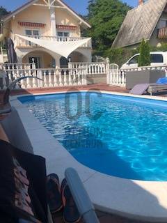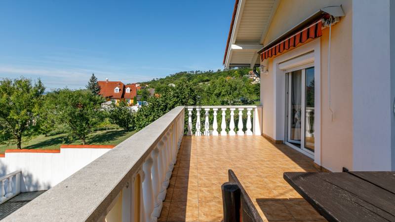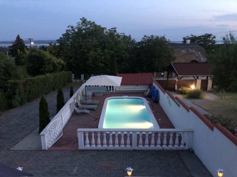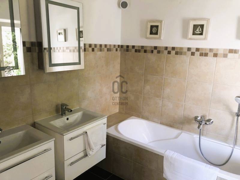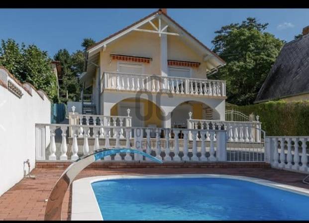 A BALATON ÉSZAKI PARTJÁN, VONYARCVASHEGYEN CSENDES KÖRNYÉKEN, NYUGODT KÖRNYEZETBEN ELADÓ PANORÁMÁS, TÖBB FUNKCIÓS CSALÁDI HÁZ ÚSZÓMEDENCÉVEL. AZ OTTHON CENTRUM KIEMELT AJÁNLATA.Az ingatlant biztonságos, kedvelt kicsi zsákutcában találjuk. Pontosan illik rá a település szlogenje: \" Mögöttünk az erdő, előttünk a víz.\" A telek 714 m2, nagyrész térkövezett, könnyen karbantartható. A ház két szintes, hatalmas terasszal, erkéllyel, ahonnan a Balaton tükrében is gyönyörködhetünk. Megbízható minőségben épült 2003-ban, néhány éve modernizálták, alakítottak a használati beosztáson.További jellemzői: - Összközműves tégla épület, cserép fedéssel. Műanyag nyílászárók. - Gáz cirkó fűtés, + két hangulatos kandalló -4 hálószoba, 3 fürdőszoba nagyobb családnak is kényelmes elhelyezést biztosít. - A nettó lakótér 120 m2, ami nem foglalja magában a teraszokat, erkélyt, tárolókat. - Helyiségek: A földszinten teraszkapcsolatos nappali, egy légterű, de szaperált modern konyhával, étkezővel. Kis közlekedőből nyílik egy fürdő, tágas hálószoba és a lépcsőfeljáró. A felső szintre belül, és külső lépcsön is fel lehet jutni. Itt három hálószobát, zuhanyzós és kádas fürdőszobaát alakítottak ki. A déli tájolású legnagyobb hálóból panoráma erkély nyílik. ( Az alaprajzon a mgnevezésekben látozás történt)A ház mögött két méretes tároló, elektromos távirányítós záróredőnyokkel. Elektromosan vezérelt kapu. Mivel a két szint külön bejárattal is rendelkezik, két generáció lakhatására, nyaralására, kiadásra is alkalmassá tehetó. Befektetésnek szintén kiváló ajánlat.A ház teljes berendezéssel. felszereléssel kerül értékesítésre, amit a vételár tartalmaz. Vonyarcvashegyet a Keszthelyi-hegység öleli körül, erdőivel, szőlőültetvényeivel, árnyas pincéivel, benne sajátos ízvilágú boraival. Ötcsillagos Lido strandja számos alkalommal érte el a Balaton legszebb, legsportosabb strandja kitüntető elismerést. A környék jellegzetessége a Csándor-hegy tetején álló Kálvária út és a végén a 2010-ben felszentelt 7,38 méter magas Fénykereszt. A Balatonból kiemelkedő egykori dombsziget, a 136 méter magas Szent Mihály domb. Tetején áll a 40 jéghalász megmenekülése emlékét őrző Szent Mihály Fogadalmi Halászkápolna, mely Magyarország, sőt a tengerparttal nem rendelkező országok egyetlen Halászkápolnája. Ez a csodás fekvésű, romantikus hangulatú szakrális hely megigézi az idelátogatókat. A hosszú évszázadok múltját őrző kápolna Vonyarcvashegy jelképévé vált.Ha felkeltette érdeklődését a fenti ingatlan, további kérdései vannak, megtekintéshez időpontot egyeztetne, kérem, hívjon, írjon a megadott elérhetőségeken.