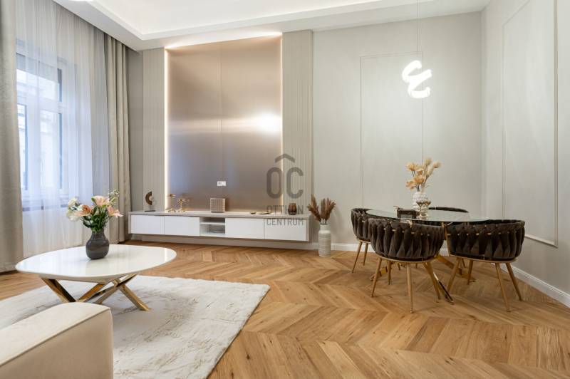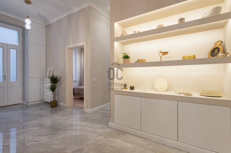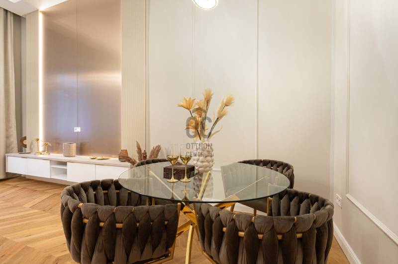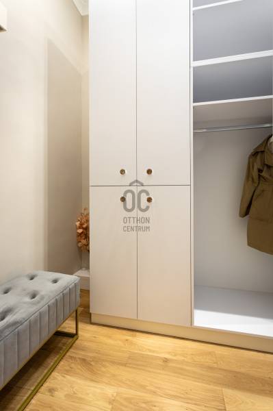 V. kerület Szemere utcában, 86 m2-es nappali + 2 hálószobás +gardrób szobás, duplakomfortos, 3. emeleti, utcai nézetű, luxuslakás eladó. Az ingatlan prémium minőségű felújításon esett át, melynek során a legkiválóbb minőségű anyagokat használták fel, a lakás minden részletében az eleganciát tükrözi.Az ingatlan amerikai konyhás nappalival rendelkezik, mindkét hálószobához külön fürdőszoba tartozik: a fő hálószobához egy elegáns káddal, WC-vel és bidével felszerelt fürdőszoba kapcsolódik, míg a második szobához egy zuhanyzós fürdő. Az ingatlan prémium minőségű bútorokkal és gépekkel együtt eladó, így az új tulajdonos azonnal beköltözhet egy teljesen felszerelt, exkluzív otthonba.A teljes körű felújítás során megtörtént a víz- és villanyvezetékek, valamint a fűtéscsövek, radiátorok cseréje. Designer csillárok, beépített szekrények, minőségi szaniterek és prémium burkolatok kerültek beszerelésre. A 4,3 méteres belmagasság igazán légies, tágas hangulatot ad a lakásnak, a chevron mintás tölgyfa parketta eleganciát és egyediséget. A konyha teljesen gépesített, AEG márkájú készülékekkel felszerelt: mosogatógép, hűtő fagyasztóval, sütő, mikró, főzőlap, páraelszívó és mosógép is rendelkezésre áll. A lakás légkondicionált.A társasház kivül, belül kiváló állapotú, az emeletre jutást 2 modern lift segíti. A lépcsőház függőfolyosós, a lakás a függőfolyosó végén található.A közvetlen közelben több busz- és villamosvonal elérhető, amelyek gyors és kényelmes kapcsolatot biztosítanak a város többi részével. Ez a lakás nem csak otthonként, hanem befektetésként is tökéletes választás azok számára, akik a belvárosi luxust és kényelmet keresik. Az ingatlan minden részlete a legmagasabb színvonalat képviseli, így garantáltan megfelel a legigényesebb vásárlók elvárásainak is.Jöjjön és helyezze magát kényelembe új otthonában!Várom megtisztelő hívását a hét minden napján!