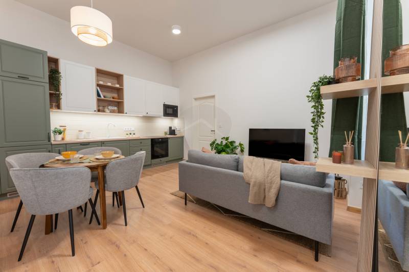 V. kerület közkedvelt részén, Vígszínháztól és a Jászai Mari tértől pár lépésnyire eladó egy teljes körűen felújított, 51 m²-es, nappali + 2 hálós lakás.A lakás egy gyönyörű, liftes ház 1. emeletén található. Az épület történelmi hangulatot áraszt.Főbb jellemzők:• kiemelt lokáció, mégis csendes lakás• a kisebbik hálóhoz saját gardróbhelyiség tartozik• tágas, világos amerikai konyhás nappali és gépesített konyha• külön fürdő, külön mellékhelyiség• teljes berendezés az árban – a bútorzat igény szerint cserélhető• beépített gardróbszekrények igény szerinti elkészítése benne van az árbanA környék kiemelkedően jó infrastruktúrával rendelkezik: éttermek, kávézók, mozi, fitneszterem, bevásárlási lehetőségek mind pár perc sétára elérhetők, a közlekedés pedig kiváló (M3-as metró, 4-6 villamos, számos troli és buszjárat).
