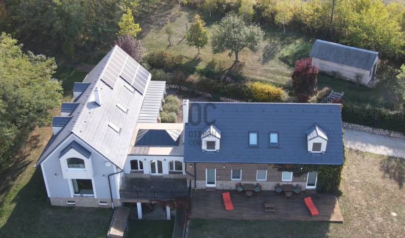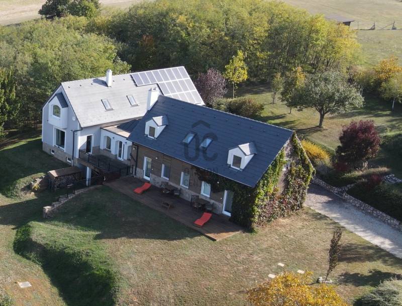 Lovasberényben, a falu Szőlőhegyén kínálok egy csodálatos birtokot, egy minden igényt kielégítő családi házzal, és 8 egyedi szálláshellyel.Rendezett, élhető településen, példa értékű oktatással (2 óvoda, művészeti református iskola) kiváló infrastruktúrával (Székesfehérvár: 20km /20perc, Budapest: 50km/45perc) és turisztikai vonzerővel (Velencei -tó, Velencei- és Vértes-hegység).Az első tulajdonosok már 20 éve elkezdték a komoly munkát, több mint 10 telek összevonásával és rendbe tételével létrehozták a birtok magját, kialakítottak 2 mesébe illő mézeskalács házikót, elültettek 170 diófát. Jelenlegi tulajdonosai pedig folyamatosan fejlesztették, szépítgették, új növényekkel, épületekkel gazdagították, melynek eredményeképp kialakult a birtok mostani arca:- 3,75 hektáros körbekerített terület, 6 Hrsz-on- 2014-ben épített hőszigetelt tégla lakóingatlan, melynek össz nettó alapterülete 366 m2 (Fsz+Tetőtér+Télikert+Pince). Ebből a saját lakórész: Amerikai konyhás nappali, plusz 5 hálószoba, 2 fürdőszoba, háztartási helyiség. Panoráma ablakok, cserépkályha teszik nagyon egyedivé és hangulatossá. A vendégrészben: 4 darab saját fürdőszobás apartman. Elektromos és vegyes tüzelésű kazán, melyeket egy nagy méretű puffer tartály egészít ki, plusz légkondik.- 2 különálló apartman-ház, saját terasszal- 2 lombház- mind a 8 szálláshely konyhával és fürdővel felszerelt, nagyrészt klimatizált apartmanok és vendégszobák, teljes felszereléssel- a szálláshelyek a birtokon belül elszórtan, de jól megközelíthetően helyezkednek el-Több gazdasági épület (összesen: 240m2) és boros pince (összesen: 40m2)-14 Kwh napelem, mely a terület áramellátását és fűtését biztosítja.-Több fő áram és vízmérő óra (220V és 380V áram, bővített hálózati kapacitással)-Elektromos autó töltő pont, 3 fázis, 3*32A-350 m2 térkövezet felület- Infra szauna- Terméskőből kirakott grillező és szalonna sütő helyek- Két pergola, 15m2 és 55m2-Gyönyörű panoráma, 240fokban a Vértes-Gerecse-Pilis-Budai hegységre-Minősített Bio Gazdálkodás-300 db termő Diófa-Termő vegyes gyümölcsös (60db), öntöző rendszerrel.-Több, mint 400 díszfával, örökzöldekkel, bokrokkal kialakított arborétumszerű környezet. Különböző juharok, hársok, tölgyek, bükk, szelíd gesztenyék, fenyők, kőrisek, platán, nyírfák, díszgalagonya, szilek, ginko, csörgő és ostor fák, fügék, ribizli, vadszeder, vadszőlő, babérmegy, buxus, korall berkenye, japán birs, levendula, zöld terülő boróka, kékszakáll, futó rózsa stb.-Kisebb akácerdő, kb 700fa-8m3-es esővíztároló és öntöző rendszer-A terület karbantartásához és gondozásához szükséges, összes kertigép, traktor, és szerszám a vételár részét képzi-Az egész terület térfigyelő kamerákkal és riasztó rendszerrel felszereltMegközelíthetőség aszfaltozott úton, a falutól 5perc autó távolságra.A birtok 2018-ban Magyarország Legszebb Birtoka díj győztese a Családi gazdálkodás kategóriában