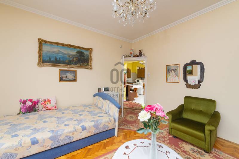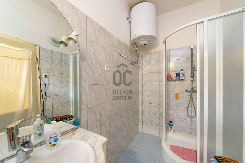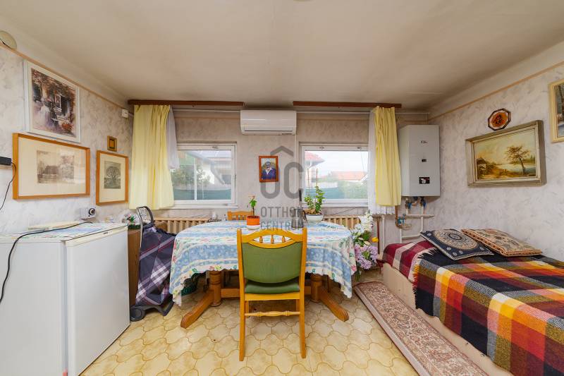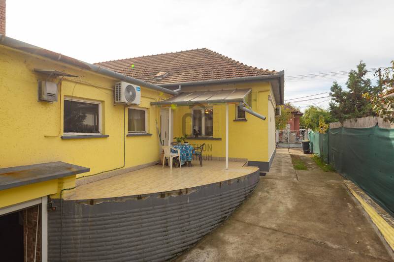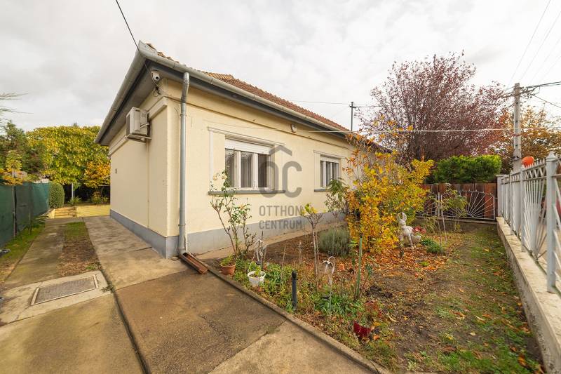 XVIII. kerületben a Béke tér környékén csendes mellékutcában, de kiváló közlekedéssel kínálunk megvásárlásra egy földszintes kialakítású ikerház felet. Klasszikus ikerház, a telek középen kerítéssel elválasztva, önálló utcai bejárat mindkét ikerfél lakói számára. A ház tégla építésű, cserép fedéses, belső elosztása tágas és kényelmes. A fedett teraszról nyílik a bejárat, egy jó méretű előszobából jutunk be a nagy méretű konyha-étkezőbe, innen két déli tájolású, világos szobát találunk, továbbá egy jó állapotú fürdőszoba, egy külön mellékhelyiség és egy belső lépcsőház is helyet kapott, innen közvetlenül juthatunk le a szuterén szinten lévő nagy garázsba. A házban kialakításra került még két szoba. A fűtést gázcirkó biztosítja, nyáron a kellemes hőmérsékletről klíma gondoskodik. A telek 303 nm, csatorna utcáról beköthető. Telken belül több autóval is parkolhatunk, a garázsban is további egy autó elfér, illetve van hely tárolásra is. A ház mögött egy kerti tároló is kialakításra került szerszámoknak, sporteszközöknek. Az utcai kapu elektromos. Csendes, családi házas mellékutca, a közelben (6 perc séta) több buszmegálló is megtalálható: 166, 236, 266, vonatállomás 5 perc séta, iskola, bevásárlási lehetőség, posta 5-10 percen belül gyalogosan elérhetők. Az ingatlan jogi háttere rendezett, rövid időn belül birtokba vehető.