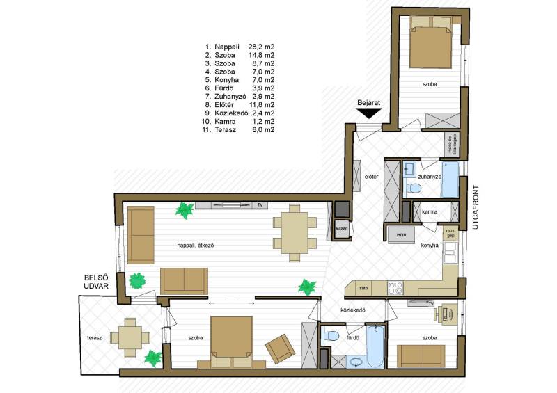 Harsánylejtő városrészben, nyugodt, zöld környezetben, mégis jó közlekedéssel kínálok megvételre egy olyan ingatlant, mely ideális helyszínt biztosít a városi élet és a természet közötti harmonikus egyensúlyhoz. Ideális választás szinte minden korosztálynak, gyermekes családoknak és fiatal párok számára egyaránt alkalmas otthont biztosít.A 87,93 nm-es alapterületű napfényes ingatlan tágas nappalival - étkezővel, külön álló ablakos konyhával - kamrával, 2 hálószobával, dolgozószobával, két fürdőszobával rendelkezik. Kényelmét biztosítja a 8 nm-es belső kertre néző terasz. A praktikumot többek között több beépített gardrób szolgálja.A lakás klímás, teljesen berendezett, gépesített konyhával, beépített gardróbokkal és teljes berendezéssel várja új tulajdonosát.A környék ellátottsága kiváló, mindössze néhány percre található bölcsőde, óvoda, játszóterek, iskolák, egyetem, Spar, gyógyszertár, cukrászda, étterme és egyéb szolgáltatások, amelyek megkönnyítik a mindennapi életet. Közelben található többek közt a Tesco, az Óbuda jégcsarnok, GoBuda Mall, Freeride park…..Közlekedés szempontjából is előnyös elhelyezkedésnek örvend, hiszen az Árpád híd autóval 8 perc és a közeli busz- és villamosmegállók révén könnyedén elérheti Budapest belvárosát. Aranyvölgy vasútállomás 7perc, a 26-os busz megállója és a 800-820-840 buszok gyalog 1perc (100m) távolságra vannak.Ez a tehermentes ingatlan tehát nem csupán egy lakás, hanem egy lehetőség arra, hogy egy olyan otthonra leljen, amely minden igényét kielégíti. A vételáron felül 10 millió Ft-ért eladó egy 16nm-es, nagy méretű beálló a mélygarázsban.További információkért és a megtekintéssel kapcsolatosan, keressen bizalommal!