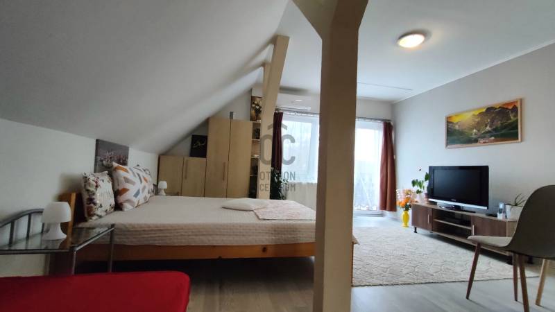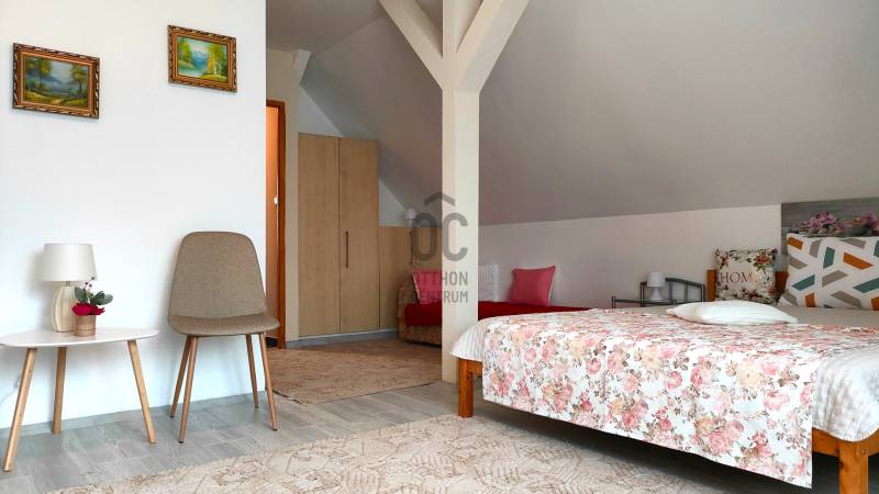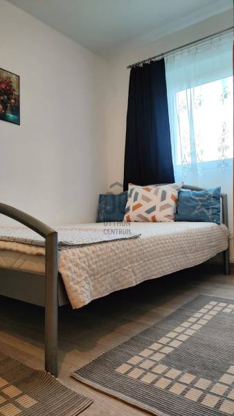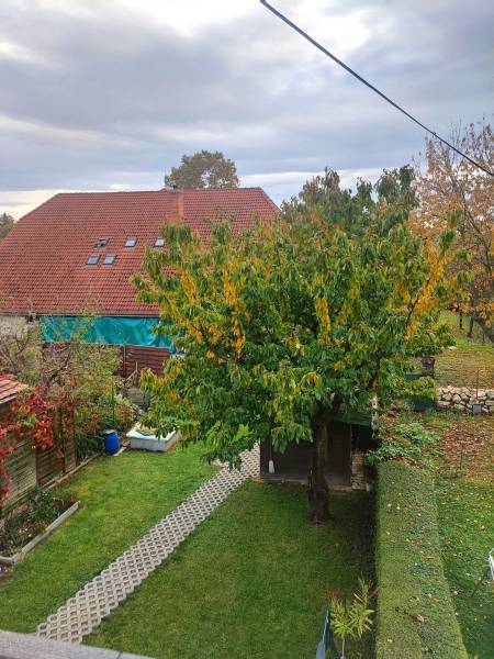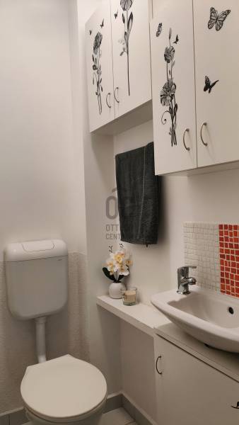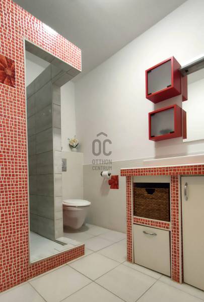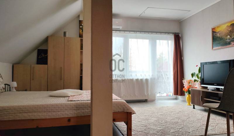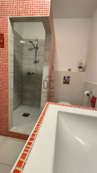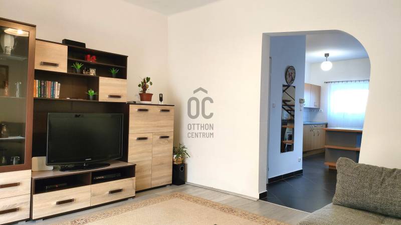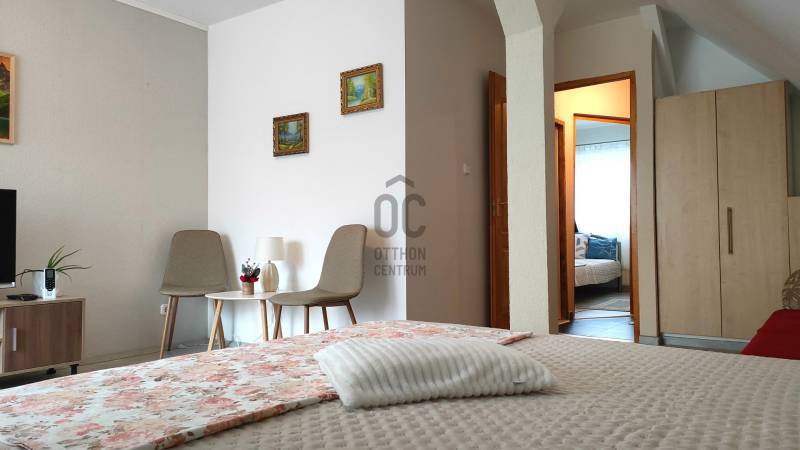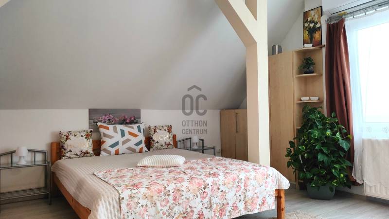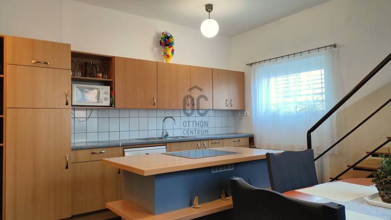 A Balaton nyugati medencéjének egyik legkedveltebb települése, Gyenesdiás, ma már nemcsak a nyári pihenés, hanem az egész éves balatoni élet szinonimája. Keszthelyhez karnyújtásnyira, Gyenesdiás lüktető részén található ez a modern szemléletben megújított ikerház jellegű, de társasházként bejegyzett ingatlan, amely technikai felszereltségével és kényelmi szintjével a térség kimagasló kínálatába illeszkedik és akár 3 %-os hitellel is elérhető!Kiemelt megbízás az Otthon Centrum kínálatában!A 415 m²-es, gondozott telek üde zöld gyepével, virágszigeteivel és termő cseresznyefájával kifejezetten hívogató. A beton gyeprácsos autólejáró praktikusan simul a kertbe, miközben a házhoz érve az új homlokzat és a letisztult színek már első pillantásra a gondos felújításról árulkodnak. A külső 10 cm-es HŐSZIGETELÉS, a korszerű nyílászárók és a 36 kW-os NAPELEMRENDSZER együttesen teszik az épületet szinte önfenntartóvá – A++ energetikai besorolásával ritkaság a Balaton mentén.A ház műszaki felszereltsége minden igényt kielégít: gázcirkó fűtés, villany, víz és csatorna teljes közművesítéssel. A 46 m2 FÖLDSZINT térszervezése praktikus és modern, ahol a fény és a tér dominál: AMERIKAI KONYHÁS NAPPALI KONYHASZIGETTEL, TERASZKAPCSOLATTAL, valamint külön toalett szolgálja a kényelmet. A nappali világos, jó arányú, közvetlen kijárattal az árnyékolóval felszerelt 18 m2 nagyságú teraszra, amely meghosszabbítja a lakóteret a szabadba – egyben kiváló helyszín reggelihez, pihenéshez vagy vendégfogadáshoz. A TETŐTÉRBE KÉNYELMES és stabil LÉPCSŐ vezet, ahol egy ELŐTÉR (5m2), egy HÁLÓSZOBA (7m2), egy ERKÉLYES SZOBA (25m2) és egy különleges, kézműves gondossággal kialakított FÜRDŐSZOBA (5m2) vár. Ez utóbbi valódi éke az otthonnak: egyedi, épített megoldásaival, természetes felületeivel és apró részleteiben is harmóniát sugárzó kivitelezésével nemcsak funkcionális, hanem esztétikai élményt is nyújt.A ház minden szeglete azt az érzést kelti, hogy itt minden tárgy a helyén van, a színek, anyagok és arányok harmóniája tudatosan megteremtett egységet alkot.A GÁZCIRKÓ fűtésnek, a korszerű gépészetnek és a napelemrendszernek köszönhetően az ingatlan négy évszakos használatra is ideális – télen meleg, nyáron hűvösen tart, miközben a rezsi szinte elenyésző. Az udvarban tárolóhelyiség is található, így a nyaraláshoz vagy a mindennapi élethez szükséges eszközök is kényelmesen elférnek. A kapubejárat mellett egy ponyvagarázs nyújt védelmet járművének.Ez az ingatlan ideális választás lehet családoknak, akik egész évben élhető, modern balatoni házat keresnek otthonnak vagy nyaralónak, befektetőknek, akik értékelik a fenntartható működést és a biztos hozamot, vagy mindazoknak, akik számára a Balaton nem csupán nyári célpont, hanem életforma.Az ingatlan jelenleg is szálláskiadásban hasznosított visszatérő vendégkörrel, így akár azonnali befektetési lehetőségként is megállja a helyét.A Balaton közelsége és Keszthely városának minden lehetősége – éttermek, strandok, vásárlási és szórakozási lehetőségek – mind könnyen elérhetők. Jöjjön el, nézze meg személyesen ezt az azonnal birtokba vehető, hibátlan állapotú, minden részletében átgondolt otthont – és érezze meg Gyenesdiás balatoni hangulatát! Hívjon bizalommal akár hétvégén is!Ez az ingatlan a \"Felező csomag\" megbízási portfólióhoz tartozik. Részletek az Otthon Centrum weboldalán.