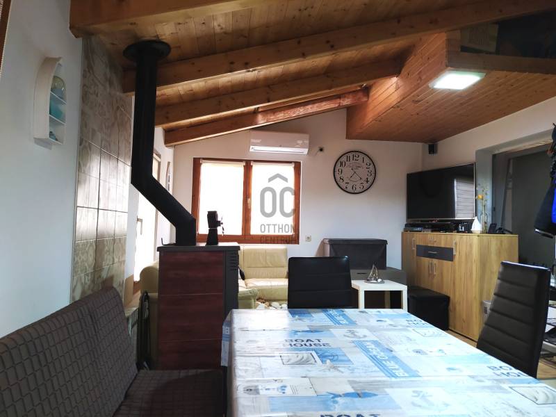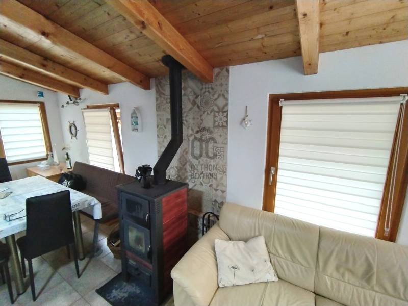 BALATONEDERICSEN KÍNÁLUNK EGY REMEK ÁLLAPOTÚ NYARALÓT / CSALÁDI HÁZAT A KESZTHELYI HEGYSÉG NYUGATI LANKÁJÁN LÉVŐ TELKEN BÉKÉS, IDILLI KÖRNYEZETBEN.A jelenleg zártkerti besorolású ingatlant csupán néhány ház választja el a belterülettől. A minden évszakban kiválóan járható murvás útja nemrég új utcanevet kapott. ( ! ) A kapubejáró három tuajdonos közös, 284 m2 -es magánútjáról nyílik. A négyzethez közelítő alakú 1054 m2-es bekerített, szép saroktelek közepén helyezkedik el az épület. A 80-as években épült nyaralót az évek során bővítették, korszerűsítették, így a mai igényeknek megfelelő kényelmes, egész évben használható hajlékban pihenhetnek tulajdonosai. Az eredeti objektum 40 cm vastag tégafalakkal készült, a nappali tökéletesen szigetelt könnyűszerkezetes építmény. Fedése palatető. Két éve minden villanyvezetéket kicseréltek, 32 Amper áramerősséggel, éjszakai árammal, moduláris konnektor vezéréssel rendelkezik a villamos áram ellátás. A lakótér beosztása:Födszint: Nappali / étkező, konyha, hálószoba, szauna, közlekedő, fürdő, wc. Felső szint: Egy 23 és egy 17 m2-es hálószoba.További jellemzők:- Vezetékes víz van, a szennyvíz csatornahálózatra kötött. - Az energiatakarékos ház 11,4 kw teljestményú kandallóval, elektromos infrapanelekkel, hűtő/fűtő kímákkal temperálható.- Vilanybojler melegíti a vizet. - Beépített villanytűzhely a konyhában.- 4 személyes finn szunát építettek a földszinti hálóhoz. - A nappaliban új fa ablakok, a többi műanyag, redőnnyel szúnyoghálóval.- Napellenző.- Tárolók a házon belül és az udvaron.- Esővíz gyűjtő.A tulajdonos vállalja az épület külső festését a vevő által kívánt színre.Irányáras ajánlat esetén minden bútor, használati eszköz a házban maradhat. Ha felketettem érdeklődését, további kérdései vannak, várom hívását / üzenetét a megadott elérhetőségeken.
