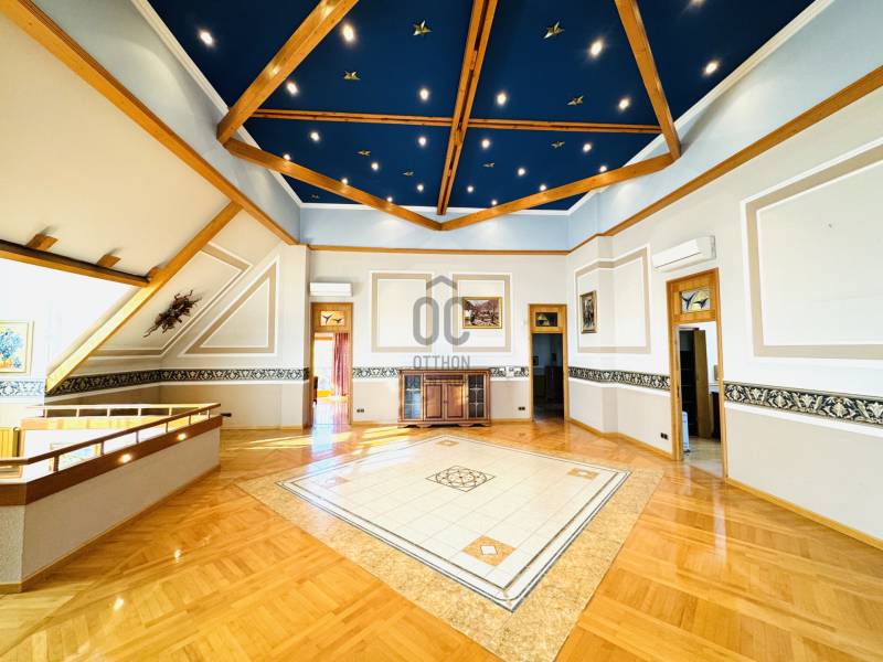 Fedezze fel álmai otthonát Diósdon – háromszintes, hét szobás, nagyvonalú családi ház eladóDiósd egyik legkedveltebb, csendes utcájában eladó egy 479 m²-es, háromszintes, exkluzív családi ház, amelyet térérzet, elegancia és átgondolt funkcionalitás jellemez. Az ingatlan egy 1111 m²-es, parkosított, szobrokkal díszített kertben helyezkedik el, ahol fűthető, római lépcsős medence és 12 m²-es télikert is szolgálja a pihenést.Földszint – a klasszikus elegancia szintjeA házba egy tágas előszobán és közlekedőn át jutunk, ahonnan megérkezünk a 36 m²-es nappaliba, amelyhez közvetlenül kapcsolódik a 12 m²-es télikertA 30 m²-es konyha–étkező–kamra egység családi és baráti összejövetelekhez ideális helyszín.Ezen a szinten található továbbá:37 m²-es hálószoba,12 m²-es gardrób,13 m²-es elegáns fürdőszoba,külön vendégmosdó,36,5 m²-es kétállásos garázs,valamint egy 13 m²-es terasz, amely a kert felé nyílik.Első emelet – a nagyvonalú terek birodalmaA felső szint 4,8 méteres belmagasságával és 73 m²-es nappali–társalgójával igazi különlegesség.Innen nyílnak a hálószobák, mind saját gardróbbal:25 m²-es hálószoba + 22 m²-es gardróbszoba,26 m²-es vendégszoba+ 21 m²-es gardróbszoba. Ezen a szinten található egy 14 m²-es, luxus kialakítású fürdőszoba valamint teraszkapcsolat is. A faburkolatú, üvegkorlátos lépcsőháza ház egyik legszebb, látványos eleme.Kertszint – külön élettér közvetlen kertkapcsolattalAz alsó szint egy önálló, teljes értékű élettér:konyha és étkezőnappali/vendégtér,fürdőszobakazánház és mosókonyhaközvetlen kijárat a gondozott kertbeFelszereltség és technológia- Vaillant gázkazán, padló- és radiátoros fűtés kombinációja-Szintenként szabályozható termosztátok-6 db Panasonic inverteres hűtő-fűtő klíma-Hóolvasztó rendszer a garázsbejárónál-A medencéhez külön fűtőkör-Automata, kútról üzemelő öntözőrendszerA kert – elegancia és nyugalomA parkosított, örökzöldekkel és díszcserjékkel beültetett kert a ház méltó folytatása.A fűthető, római lépcsős medence, a szobrok valamint a télikert együttese páratlan harmóniát teremt.Ez az ingatlan azok számára ideális választás, akik nem csupán házat, hanem életstílust keresnek – ahol a tér, az elegancia és a kifinomult részletek találkoznak.