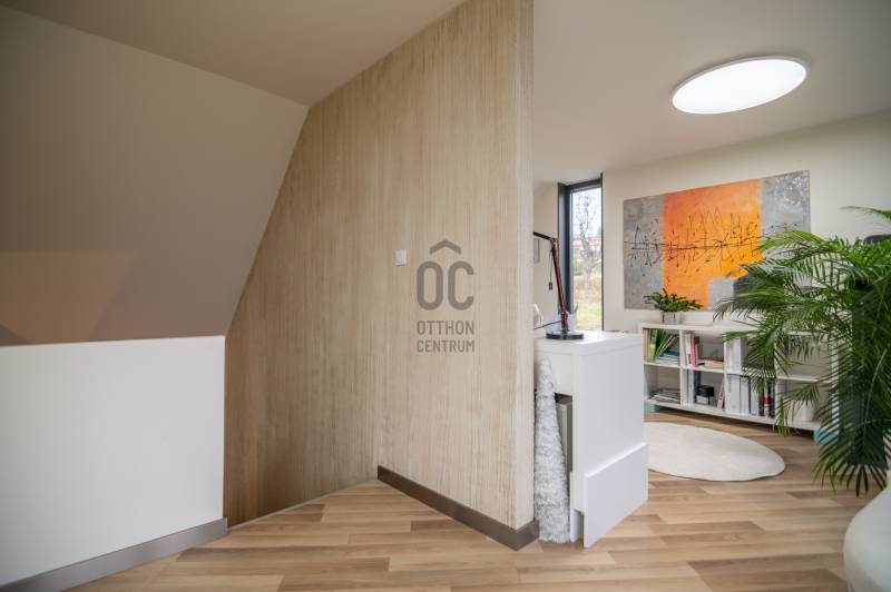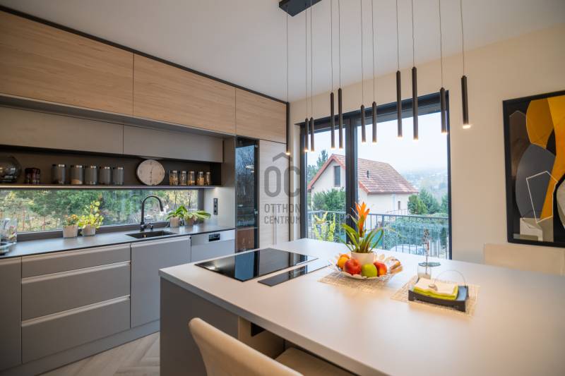 A III. kerület csendes, zöldövezeti részén, Ürömhegyen kínálunk eladásra egy minden részletében átgondolt, egyedi tervezésű otthont. A modern építészet és a természetközeli életstílus tökéletes harmóniában találkozik ebben a házban, amelyet kiemelkedő szakmai referenciákkal rendelkező belsőépítész alkotott meg.A ház egy rézsűs telek felső részén áll, így a panoráma és a fény egyszerre része a mindennapoknak. A letisztult formák, természetes anyagok és a napfényes terek elegáns, mégis otthonos hangulatot teremtenek.FŐBB JELLEMZŐK- Prokoncept építési rendszer, német fa szerkezeti elemek- A+ energetikai besorolás, levegő-víz hőszivattyús rendszer- Padlófűtés, mennyezethűtés-fűtés, hővisszanyerős szellőztetés előkészítve- Rehau nyílászárók, mindenhol motoros redőnyök- 20 millió Ft értékű egyedi konyha és beépített bútorzat- Beépített gépek: AEG főzőlap, Whirlpool sütő és mikro, Gorenje hűtő- Klarstein elszívó, fekete csaptelepek, screenüvegek a vizes helyiségekben- Jacuzzi-előkészítés a panorámás tetőteraszon- 2 autós garázs, elektromos töltő és napelem-előkészítésKERT ÉS KÜLSŐ TEREKA ház körül kialakított, mintegy 400 nm-es kert a természetes anyagokra és a rendezettségre épül.A geotextíliás alapozás és a dísznövényeknek köszönhetően a kert szinte gondozásmentes, mégis élő, harmonikus zöldfelületet kínál.A teraszról a panoráma a főszereplő: az előtető véd az esőtől és a naptól, a csöpögő rendszer pedig automatikusan öntözi a növényeket.A tér kialakítása lehetővé teszi jacuzzi vagy kisebb medence elhelyezését is – a nyugalom és a kényelem kompromisszumok nélkül adott.LOKÁCIÓ ÉS KÖZLEKEDÉS- 218-as buszmegálló pár lépésre található, közvetlen kapcsolatot biztosít Óbudával (Szentlélek tér).- Az Aranyvölgy vasútállomás 5 perc sétára elérhető, ahonnan a Nyugati pályaudvar 15 perc alatt megközelíthető.- Autóval az Árpád híd 15 perc alatt elérhető, a Bécsi úti bevásárlóközpontok (Tesco, Aldi, Praktiker, Decathlon) pedig mindössze néhány percre találhatók.A környék infrastruktúrája fejlett: iskola, óvoda, gyógyszertár, kisboltok és sportlehetőségek is könnyen elérhetők. A Csillaghegyi strandfürdő és uszoda autóval néhány perc, akárcsak a közeli túraútvonalak és kilátópontok.Földszint:Tágas, 42 nm-es nappali–konyha–étkező nagy üvegfelületekkel és dél-nyugati tájolással.Teljesen gépesített, beépített konyha étkezőpulttal kombinált főzőszigettel.Két külön nyíló, kertkapcsolatos hálószoba és zuhanyzós fürdő vendég-WC-vel.A nappaliból közvetlen kijárat az árnyékos teraszra és a gabion zuhanyfallal kialakított pihenőkertbe.Emelet:Világos, egybenyitott tér, amely igény szerint master bedroom + gardróbként is kialakítható.Külön fürdőszoba háztartási funkcióval és tárolókkal.A 28 nm-es panorámás tetőteraszról a Hármashatár-hegy látványa tárul elénk, jacuzzi-előkészítéssel.Garázsszint / Gépészet:Kétállásos garázs, automata kapuval.Szauna, kondiszoba vagy tároló kialakítására alkalmas hátsó tér.Hőszivattyús padló- és mennyezeti hűtés-fűtés, előkészített napelem és elektromos autótöltő csatlakozás.Ez az otthon azoknak szól, akik értékelik a modern építészet időtálló formavilágát, a természetes fényt, és a letisztult, gondosan megtervezett tereket.Ürömhegy egyik legszebb pontján található, ahol a panoráma, a nyugalom és a minőség valódi értékké válik.Amennyiben felkeltette az érdeklődését ez minden részletében művészien kidolgozott ingatlan, kérem keressen bizalommal!Díjmentes, bankfüggetlen hiteltanácsadással támogatjuk vevő ügyfeleinket a számukra legelőnyösebb finanszírozási döntések meghozatalában.Opcionálisan igénybe vehető kiegészítő szolgáltatásainkkal – mint ügyvédi közreműködés, energetikai tanúsítvány vagy villamos biztonsági felülvizsgálat – teljes körű szakmai támogatást nyújtunk az adásvétel folyamatának minden egyes lépésénél.