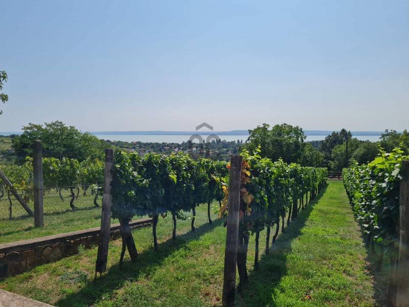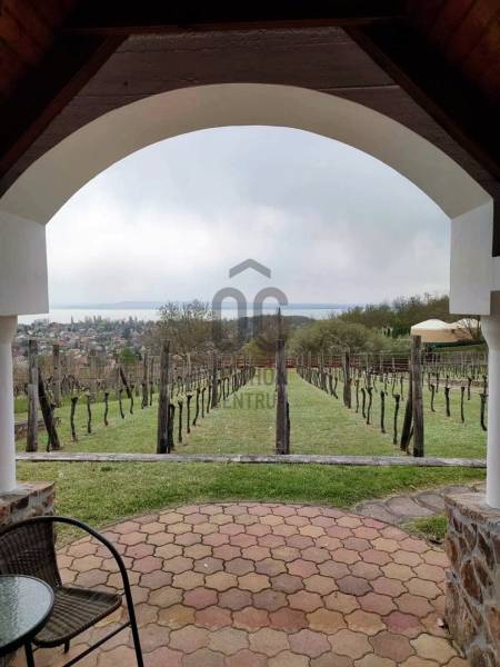 KIEMELT MEGBÍZÁS AZ OTTHON CENTRUM KÍNÁLATÁBAN!Ábrahámhegy festői környezetben a Balaton északi partján a nyugat felől magasodó Örsi hegy és a Tapolcai-medence tanúhegyeinek karéjában fekszik. A táj ősidők óta hazája a szőlőnek és a bornak és a nyári időszakban itt található a környék egyik legkedveltebb fürdőhelye is.A település egyik legmagasabb pontján vált eladóvá ez a különleges kialakítású, Balaton-felvidéki hangulatot árasztó ingatlan a hozzá tartozó 2067 m²-es szőlős területtel.A terület télen-nyáron jól járható úton közelíthető meg, teljesen körbekerített. A telekre betelepített Szürkebarát szőlő folyamatosan gondozott, karbantartott. Az utcafronti részt terméskő kerítés határolja, ez a kőmunka folytatódik az autófeljárón és a támfalakon, valamint a ház egészét is helyi \"vöröskő\" burkolja körbe, így kölcsönözve egyedi és tájba illő hangulatot a birtoknak.A gazdasági épületként bejegyzett ház 2005-ben épült, 3 szinten összesen 146 m²-es hasznos területtel rendelkezik. Az 50 cm-es kő-tégla falakkal rendelkező masszív épület szintjei épületen belül átjárhatóak. A házba hűtő-fűtő klímák kerültek betelepítésre, melyek áramellátását a kiépített napelemrendszer biztosítja, ezenfelül a fűtés a ház alsó- és földszinti részén fatüzelésű kályha használatával is kiegészíthető.A ház szintenkénti elosztása:Alsó szint: konyha, étkező, nappali/ háló, fürdőszoba, tároló, egyedi kialakítású, hangulatos borospinceFöldszint: nappali, étkező, konyha, fürdőszoba, lépcsőház és terasz.Emelet: 3 hálószoba és előszobaA házban riasztórendszer került kiépítésre. Az áram valamint a vezetékes víz bevezetésre került, szennyvíz derítő áll rendelkezésre a szennyvízelvezetéshez. Az esővíz gyűjtésére 2 ciszterna is kialakításra került, melyekből a locsolás könnyedén megoldható.A földszinti részhez kapcsolódó - nyári időszakban plusz életteret biztosító - hatalmas teraszról, de a telekről és a ház egészéből is teljes rálátást kapunk az előttünk elterülő Balaton vizére!A zárt parkolórészen és fedett kocsibeállón több autó egyidejű parkolása is lehetséges.Ajánlom az ingatlant mindazok figyelmébe,akik a \"béke szigetét\" keresik távol a mindennapoktól. A ház tökéletes nyaralónak, turisztikai befektetésként is vonzó lehet és állandó lakhatásra is alkalmas!Amennyiben kérdése merülne fel az ingatlannal kapcsolatban vagy szeretné azt megtekinteni, kérem keressen a megadott elérhetőségek egyikén!