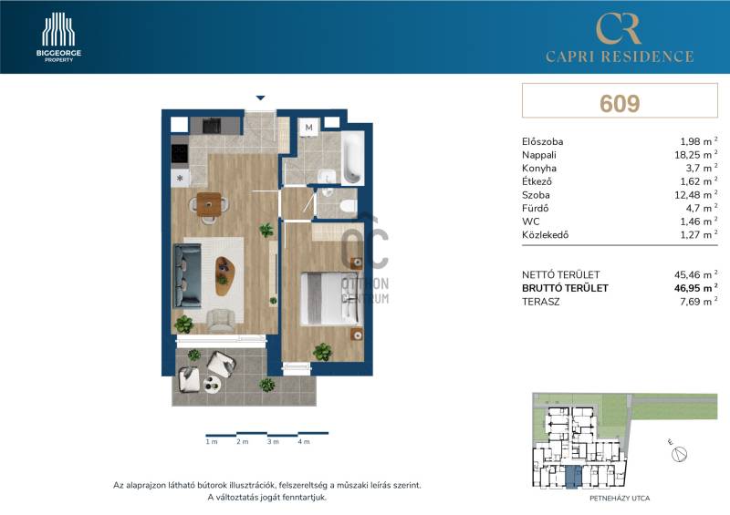 Projekt bemutatásaA Capri Residence a XIII. kerület szívében, a dinamikusan fejlődő Váci út közvetlen közelében valósul meg, amely Budapest egyik legkeresettebb lakáspiaci területe. Az elegáns, modern megjelenésű épületet, a homlokzatán végigfutó üvegkorlátos teraszok díszítik majd, a felsőbb szinteken pedig nagyteraszos lakások is elérhetők, amelyek egy része panorámás kilátást biztosít.Az épületben összesen 112 lakás kap helyet, amelyek elrendezése a stúdiótól a nappali plusz három hálószobásig terjednek. Az épületben emellett egy közösségi tér, 122 parkolóhely, 62 tároló, valamint opcionálisan elektromos autótöltővel szerelt teremgarázs beállók is megépítésre kerülnek.A műszaki felszereltség a legmagasabb szakmai trendeket követi: a Capri Residence lakóinak kényelmét mennyezeti hűtés-fűtés, háromrétegű üvegezéssel ellátott műanyag nyílászárók, smart-home előkészítés, valamint belsőépítész által összeállított belső anyagválaszték biztosítja majd. A földszinti lakásokhoz privát kertkapcsolat tartozik, emellett a társasház közös díszkerttel is rendelkezik.