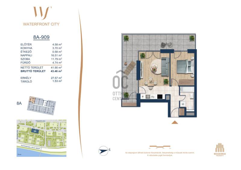 Projekt bemutatásaA projektrőlA Waterfront City egy új, modern városnegyed a 3. kerületben, ahol a természet közelsége és a városi kényelem tökéletes egyensúlyban van. A Duna-part közvetlen szomszédságában elhelyezkedő fejlesztés különleges atmoszférát kínál: a sétányt új épületek határolják, üzletekkel, kávézókkal és szolgáltatásokkal, amelyek élhető közösségi teret teremtenek.A 13 emeletes lakóépületből lenyűgöző örökpanoráma nyílik a budai hegyekre és a folyóra, a tágas teraszok pedig ideálisak a pihenéshez vagy a baráti összejövetelekhez. A zöldtetők, parkosított terek és fenntartható megoldások – mint az energiatakarékos rendszerek és okos otthon funkciók – mind hozzájárulnak a modern, környezettudatos életstílushoz.Látogass el értékesítési irodánkba, és tekintsd meg a városnegyed makettjét személyesen! Ismerd meg, milyen lesz az élet Budapest egyik legizgalmasabb új fejlesztésében!Óbuda szívébenKépzeld el, ahogy egy napsütéses délelőttön Óbuda szívében sétálsz, a Duna közelsége frissítően hat rád, miközben a Folyamőr utca, a Miklós tér és a Bogdáni út által határolt, öt hektáros területre érsz. A levegőben ott van a város történelme, mégis minden részletében a jövő hívogat.A 50 000 négyzetméteres területen egy hangulatos sétány vezet végig, amely egyenesen az óbudai Fő térre visz – mindössze 600 méterre. Ez a sétány nem csupán összeköt, hanem élményt nyújt: a Kolosy térről induló Óbudai Promenád részeként a város egyik legélhetőbb, legpezsgőbb szakaszán haladsz végig. És ha biciklivel érkeznél? A nemzetközi kerékpárút is itt halad el, Szentendre felé vezetve.Az 5. ütemben épülő 149 lakás mindegyike egyedi hangulatot kínál. Ahogy belépsz egy-egy otthonba, a hatalmas üvegfelületeken át beáradó fény és a tágas, szellős terek azonnal magukkal ragadnak. A kilátás? A Kaszap István park zöldje nyújt békét, míg a felsőbb emeletekről a Budai-hegység örökpanorámája tárul eléd – minden nap egy új festmény az ablakodban.A 6. ütemben 316 modern lakás épül, tágas teraszokkal és lenyűgöző kilátással a Dunára és a budai hegyekre. A lakók kényelmét őrszolgálat, kamerarendszer, mélygarázs, vendéglátóhelyek, belső park, játszótér és E-autó töltők szolgálják. Ez a projekt utolsó üteme, amely még közvetlen Duna-parti kapcsolattal rendelkezik.