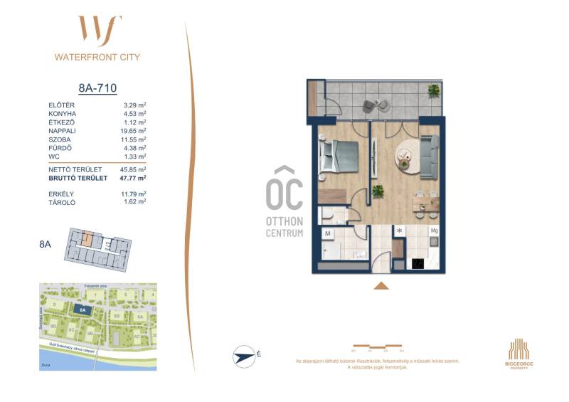 Projekt bemutatásaA projektrőlA Waterfront City egy új, modern városnegyed a 3. kerületben, ahol a természet közelsége és a városi kényelem tökéletes egyensúlyban van. A Duna-part közvetlen szomszédságában elhelyezkedő fejlesztés különleges atmoszférát kínál: a sétányt új épületek határolják, üzletekkel, kávézókkal és szolgáltatásokkal, amelyek élhető közösségi teret teremtenek.A 13 emeletes lakóépületből lenyűgöző örökpanoráma nyílik a budai hegyekre és a folyóra, a tágas teraszok pedig ideálisak a pihenéshez vagy a baráti összejövetelekhez. A zöldtetők, parkosított terek és fenntartható megoldások – mint az energiatakarékos rendszerek és okos otthon funkciók – mind hozzájárulnak a modern, környezettudatos életstílushoz.Látogass el értékesítési irodánkba, és tekintsd meg a városnegyed makettjét személyesen! Ismerd meg, milyen lesz az élet Budapest egyik legizgalmasabb új fejlesztésében!Óbuda szívébenKépzeld el, ahogy egy napsütéses délelőttön Óbuda szívében sétálsz, a Duna közelsége frissítően hat rád, miközben a Folyamőr utca, a Miklós tér és a Bogdáni út által határolt, öt hektáros területre érsz. A levegőben ott van a város történelme, mégis minden részletében a jövő hívogat.A 50 000 négyzetméteres területen egy hangulatos sétány vezet végig, amely egyenesen az óbudai Fő térre visz – mindössze 600 méterre. Ez a sétány nem csupán összeköt, hanem élményt nyújt: a Kolosy térről induló Óbudai Promenád részeként a város egyik legélhetőbb, legpezsgőbb szakaszán haladsz végig. És ha biciklivel érkeznél? A nemzetközi kerékpárút is itt halad el, Szentendre felé vezetve.Az 5. ütemben épülő 149 lakás mindegyike egyedi hangulatot kínál. Ahogy belépsz egy-egy otthonba, a hatalmas üvegfelületeken át beáradó fény és a tágas, szellős terek azonnal magukkal ragadnak. A kilátás? A Kaszap István park zöldje nyújt békét, míg a felsőbb emeletekről a Budai-hegység örökpanorámája tárul eléd – minden nap egy új festmény az ablakodban.A 6. ütemben 316 modern lakás épül, tágas teraszokkal és lenyűgöző kilátással a Dunára és a budai hegyekre. A lakók kényelmét őrszolgálat, kamerarendszer, mélygarázs, vendéglátóhelyek, belső park, játszótér és E-autó töltők szolgálják. Ez a projekt utolsó üteme, amely még közvetlen Duna-parti kapcsolattal rendelkezik.