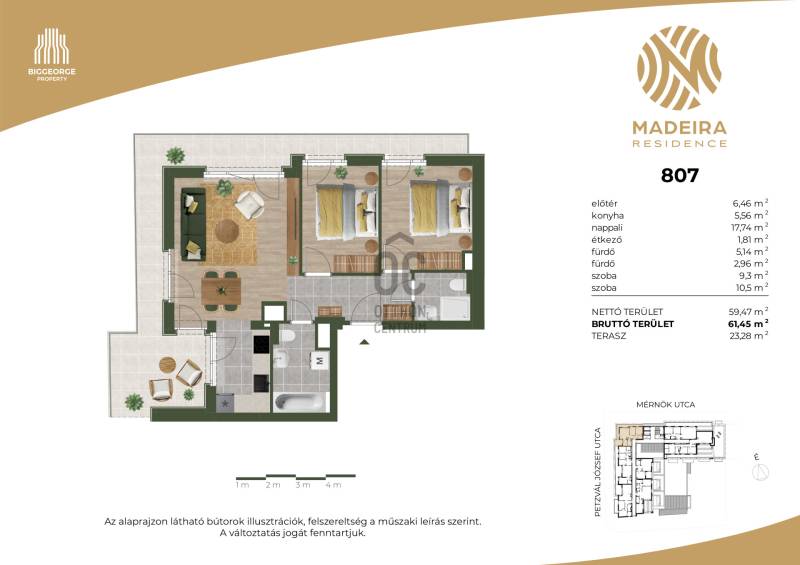 Projekt bemutatásaA projektrőlKépzeld el, ahogy belépsz Újbuda egyik legbékésebb, zöldövezeti utcájába, ahol a nyugalom átveszi a helyét a város zajos ritmusától. A Mérnök utcában, a Fehérvári út és az Etele út találkozásának közelében, egy elegánsan modern épület rajzolódik ki előtted – ez a Madeira Residence.Ahogy közelebb lépsz, a homlokzat letisztultsága, a loggiák ritmikus váltakozása azonnal megragadja a tekinteted. A pálcás korlátok finom eleganciát sugároznak, a napfény pedig játékosan tükröződik a teraszok üvegfelületein. Már kívülről is érezni: ez nem csupán egy lakóépület, hanem egy életérzés.Az első emeleti lakások egy része saját tetőkerttel rendelkezik – képzeld el, ahogy reggel a kávédat kortyolgatod a saját kis zöld oázisodban, miközben a madarak csicsergése tölti be a teret. Minden lakásban ott a tágas nappali, a kényelmes hálószobák, és a saját erkély vagy terasz, ahol a nap bármely szakában megpihenhetsz.A Madeira Residence nem csupán egy új építésű társasház – ez egy hely, ahol a modern életstílus találkozik a természet közelségével és a családbarát környezettel. Egy otthon, ahol minden nap élmény.A belső térben a kényelem és a fenntarthatóság kéz a kézben jár. A mennyezeti hűtés-fűtés rendszer csendesen gondoskodik a kellemes hőmérsékletről, az okosotthon-előkészítés pedig lehetővé teszi, hogy a technológia valóban a kényelmedet szolgálja. A mélygarázsban kényelmes parkolás vár, a kerékpártárolók és az elektromos autótöltési lehetőség pedig a környezettudatos életmódot támogatják.A környék infrastruktúrája kiváló: a közelben kiépített kerékpárutak, car sharing szolgáltatások és elektromos rollerek teszik egyszerűvé és fenntarthatóvá a közlekedést. A családosok számára külön öröm, hogy több játszótér is található a közelben – a gyerekek biztonságban, szabadon játszhatnak, miközben a szülők nyugodtan élvezhetik a környék nyugalmát.A Madeira Residence nem csupán egy új lakóépület – ez egy életérzés, ahol a mindennapok élménnyé válnak.