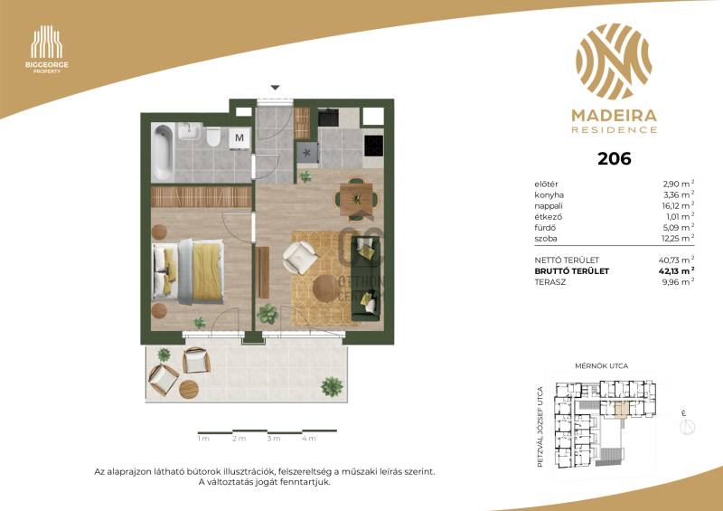 Projekt bemutatásaA projektrőlKépzeld el, ahogy belépsz Újbuda egyik legbékésebb, zöldövezeti utcájába, ahol a nyugalom átveszi a helyét a város zajos ritmusától. A Mérnök utcában, a Fehérvári út és az Etele út találkozásának közelében, egy elegánsan modern épület rajzolódik ki előtted – ez a Madeira Residence.Ahogy közelebb lépsz, a homlokzat letisztultsága, a loggiák ritmikus váltakozása azonnal megragadja a tekinteted. A pálcás korlátok finom eleganciát sugároznak, a napfény pedig játékosan tükröződik a teraszok üvegfelületein. Már kívülről is érezni: ez nem csupán egy lakóépület, hanem egy életérzés.Az első emeleti lakások egy része saját tetőkerttel rendelkezik – képzeld el, ahogy reggel a kávédat kortyolgatod a saját kis zöld oázisodban, miközben a madarak csicsergése tölti be a teret. Minden lakásban ott a tágas nappali, a kényelmes hálószobák, és a saját erkély vagy terasz, ahol a nap bármely szakában megpihenhetsz.A Madeira Residence nem csupán egy új építésű társasház – ez egy hely, ahol a modern életstílus találkozik a természet közelségével és a családbarát környezettel. Egy otthon, ahol minden nap élmény.A belső térben a kényelem és a fenntarthatóság kéz a kézben jár. A mennyezeti hűtés-fűtés rendszer csendesen gondoskodik a kellemes hőmérsékletről, az okosotthon-előkészítés pedig lehetővé teszi, hogy a technológia valóban a kényelmedet szolgálja. A mélygarázsban kényelmes parkolás vár, a kerékpártárolók és az elektromos autótöltési lehetőség pedig a környezettudatos életmódot támogatják.A környék infrastruktúrája kiváló: a közelben kiépített kerékpárutak, car sharing szolgáltatások és elektromos rollerek teszik egyszerűvé és fenntarthatóvá a közlekedést. A családosok számára külön öröm, hogy több játszótér is található a közelben – a gyerekek biztonságban, szabadon játszhatnak, miközben a szülők nyugodtan élvezhetik a környék nyugalmát.A Madeira Residence nem csupán egy új lakóépület – ez egy életérzés, ahol a mindennapok élménnyé válnak.