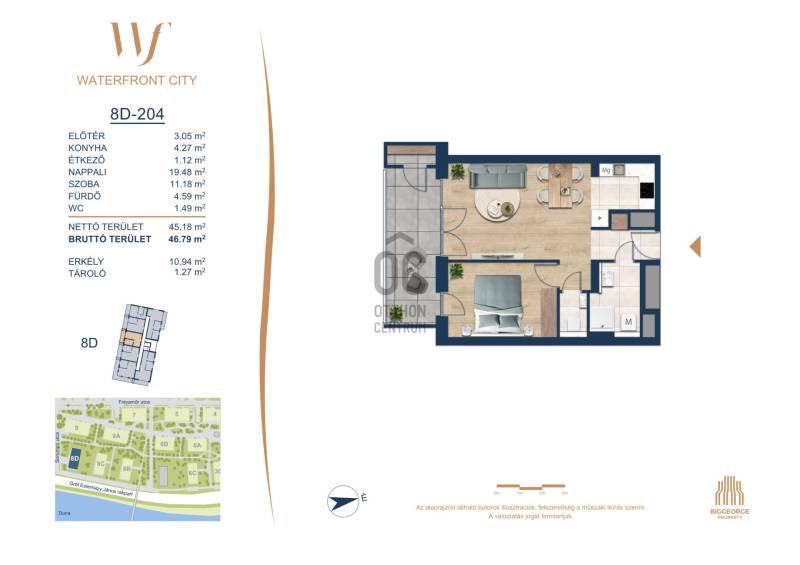Projekt bemutatásaA projektrőlA Waterfront City egy új, modern városnegyed a 3. kerületben, ahol a természet közelsége és a városi kényelem tökéletes egyensúlyban van. A Duna-part közvetlen szomszédságában elhelyezkedő fejlesztés különleges atmoszférát kínál: a sétányt új épületek határolják, üzletekkel, kávézókkal és szolgáltatásokkal, amelyek élhető közösségi teret teremtenek.A 13 emeletes lakóépületből lenyűgöző örökpanoráma nyílik a budai hegyekre és a folyóra, a tágas teraszok pedig ideálisak a pihenéshez vagy a baráti összejövetelekhez. A zöldtetők, parkosított terek és fenntartható megoldások – mint az energiatakarékos rendszerek és okos otthon funkciók – mind hozzájárulnak a modern, környezettudatos életstílushoz.Látogass el értékesítési irodánkba, és tekintsd meg a városnegyed makettjét személyesen! Ismerd meg, milyen lesz az élet Budapest egyik legizgalmasabb új fejlesztésében!Óbuda szívébenKépzeld el, ahogy egy napsütéses délelőttön Óbuda szívében sétálsz, a Duna közelsége frissítően hat rád, miközben a Folyamőr utca, a Miklós tér és a Bogdáni út által határolt, öt hektáros területre érsz. A levegőben ott van a város történelme, mégis minden részletében a jövő hívogat.A 50 000 négyzetméteres területen egy hangulatos sétány vezet végig, amely egyenesen az óbudai Fő térre visz – mindössze 600 méterre. Ez a sétány nem csupán összeköt, hanem élményt nyújt: a Kolosy térről induló Óbudai Promenád részeként a város egyik legélhetőbb, legpezsgőbb szakaszán haladsz végig. És ha biciklivel érkeznél? A nemzetközi kerékpárút is itt halad el, Szentendre felé vezetve.Az 5. ütemben épülő 149 lakás mindegyike egyedi hangulatot kínál. Ahogy belépsz egy-egy otthonba, a hatalmas üvegfelületeken át beáradó fény és a tágas, szellős terek azonnal magukkal ragadnak. A kilátás? A Kaszap István park zöldje nyújt békét, míg a felsőbb emeletekről a Budai-hegység örökpanorámája tárul eléd – minden nap egy új festmény az ablakodban.A 6. ütemben 316 modern lakás épül, tágas teraszokkal és lenyűgöző kilátással a Dunára és a budai hegyekre. A lakók kényelmét őrszolgálat, kamerarendszer, mélygarázs, vendéglátóhelyek, belső park, játszótér és E-autó töltők szolgálják. Ez a projekt utolsó üteme, amely még közvetlen Duna-parti kapcsolattal rendelkezik.