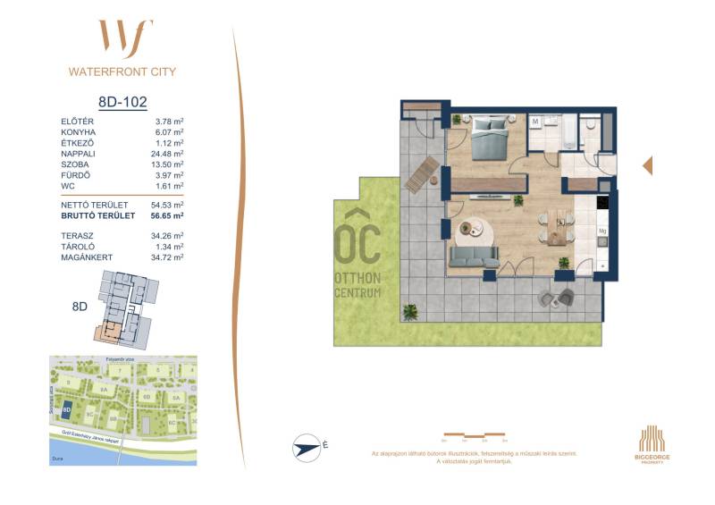 Projekt bemutatásaA projektrőlA Waterfront City egy új, modern városnegyed a 3. kerületben, ahol a természet közelsége és a városi kényelem tökéletes egyensúlyban van. A Duna-part közvetlen szomszédságában elhelyezkedő fejlesztés különleges atmoszférát kínál: a sétányt új épületek határolják, üzletekkel, kávézókkal és szolgáltatásokkal, amelyek élhető közösségi teret teremtenek.A 13 emeletes lakóépületből lenyűgöző örökpanoráma nyílik a budai hegyekre és a folyóra, a tágas teraszok pedig ideálisak a pihenéshez vagy a baráti összejövetelekhez. A zöldtetők, parkosított terek és fenntartható megoldások – mint az energiatakarékos rendszerek és okos otthon funkciók – mind hozzájárulnak a modern, környezettudatos életstílushoz.Látogass el értékesítési irodánkba, és tekintsd meg a városnegyed makettjét személyesen! Ismerd meg, milyen lesz az élet Budapest egyik legizgalmasabb új fejlesztésében!Óbuda szívébenKépzeld el, ahogy egy napsütéses délelőttön Óbuda szívében sétálsz, a Duna közelsége frissítően hat rád, miközben a Folyamőr utca, a Miklós tér és a Bogdáni út által határolt, öt hektáros területre érsz. A levegőben ott van a város történelme, mégis minden részletében a jövő hívogat.A 50 000 négyzetméteres területen egy hangulatos sétány vezet végig, amely egyenesen az óbudai Fő térre visz – mindössze 600 méterre. Ez a sétány nem csupán összeköt, hanem élményt nyújt: a Kolosy térről induló Óbudai Promenád részeként a város egyik legélhetőbb, legpezsgőbb szakaszán haladsz végig. És ha biciklivel érkeznél? A nemzetközi kerékpárút is itt halad el, Szentendre felé vezetve.Az 5. ütemben épülő 149 lakás mindegyike egyedi hangulatot kínál. Ahogy belépsz egy-egy otthonba, a hatalmas üvegfelületeken át beáradó fény és a tágas, szellős terek azonnal magukkal ragadnak. A kilátás? A Kaszap István park zöldje nyújt békét, míg a felsőbb emeletekről a Budai-hegység örökpanorámája tárul eléd – minden nap egy új festmény az ablakodban.A 6. ütemben 316 modern lakás épül, tágas teraszokkal és lenyűgöző kilátással a Dunára és a budai hegyekre. A lakók kényelmét őrszolgálat, kamerarendszer, mélygarázs, vendéglátóhelyek, belső park, játszótér és E-autó töltők szolgálják. Ez a projekt utolsó üteme, amely még közvetlen Duna-parti kapcsolattal rendelkezik.