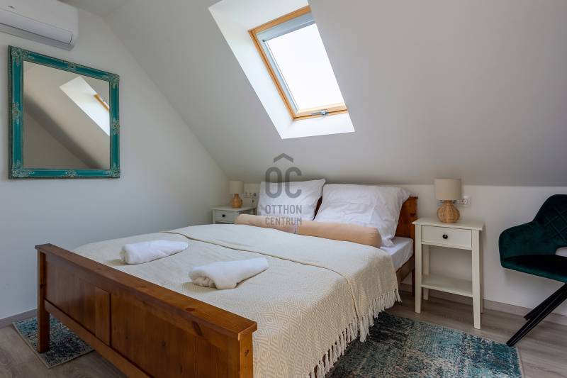 Balaton északi partján, csodállatos természetközeli településen Kékkúton kínálunk megvételre egy felújított többgenerációs családi házat.A 221 m²-es, kétszintes, teljes körűen felújított lakóház besorolású ingatlan a Balatontól mindössze pár percre található, 1460 m²-es parkosított telken!Az épület kőből épült, kívülről 12 cm szigeteléssel ellátott, tetőtere beépített. A korszerűsítés során új villamos- és vízhálózat került kiépítésre. A nyílászárók fából vannak és hőszigetelt üveggel ellátottak. A tető cserépfedésű, szigetelt.Az ingatlan elrendezése lehetővé teszi több család kényelmes együttélését valamint szálláshelyként való üzemeltetését is.ELRENDEZÉSEFöldszint:*Első lakórész: gépesített, tágas konyha-étkező, 1 hálószoba, fürdőszoba, külön mosókonyha/tároló*Fedett télikert: az épület két része között, kiváló közösségi tér, reggeliző- és kávézóterasz *További helyiségek: közös konyha feljárattal az emeletre, fürdőszoba WC-vel, közlekedő, szoba, gépészetEmelet: *3 külön bejáratú szoba, mindegyik saját fürdőszobával és WC-vel, közlekedő/közösségi térModern, energiahatékony megoldások: Elektromos padlófűtés és melegvíz ellátás hőtárolós rendszerrel Kályha az első lakótérben 5 db hűtő-fűtő klíma Napelemrendszer – alacsony fenntartási költség 3×32 A áramerősségKívül-belül rendezett Elektromos kapuval ellátott bejárat Elöl térkövezett udvar Hátul parkosított kert: gyümölcsfák, kerti tó, füvesített pihenőtérExtrák: Szauna, kültéri dézsafürdő Igényesen berendezés, vadonatúj minőségi bútorokkal Udvaron napernyők, nyugágyak, kerti bútorok és hinta Az ingatlan kiváló befektetés, szuper lehetőség, hogy egyben egy jövedelmező családi vállalkozásra tegyen szert.Kékkút a Káli-medence egyik legnyugodtabb és legszebb települése, a Theodora-forrás szomszédságában. Kiváló választás, ha otthonát a természethez közel, de mégis a Balaton közelségében szeretné megtalálni – akár magáncélra, akár üzleti befektetésként.Érdeklődjön most – ne maradjon le erről a páratlan lehetőségről!