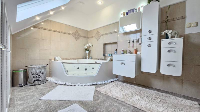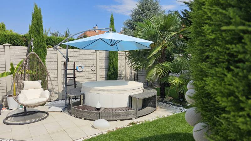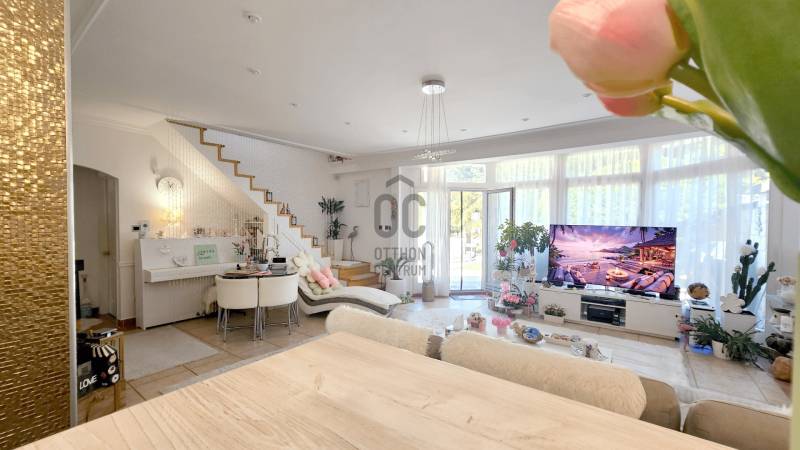 Törökbálint – Tükörhegyi csodaFelújított, kiváló műszaki állapotú, önálló hrsz.-számú sorház középső tagja eladóA 160 m²-es, kétszintes ingatlan 1997-ben épült, könnyűszerkezetes technológiával, kiváló hőszigeteléssel. A ház folyamatosan karbantartott és teljeskörűen felújított: megújult az elektromos hálózat, a fűtési rendszer, a tető, a beltér és a kert is.A ház fizikailag teljesen különálló, nincs közös fal a szomszédokkal.Műszaki jellemzők- Bosch kondenzációs kazán- Padlófűtés- Inverteres klíma- Intelligens, telefonról vezérelhető hűtés–fűtés és világítás-LED világítás- Alacsony fenntartási költségekWellness és felszereltség- Beltéri és kültéri jacuzzi-Finn szauna- Megvilágított sólappal épített sófal- Dyson légtisztítók és párásító- Riasztó- és kamerarendszerKert- Ősfás, rendezett kert- Exotikus és dísznövények- Automata öntözőrendszer- Könnyen fenntartható, intim térBelső elrendezésFöldszint – kb. 80 m²Tágas, világos terekkel rendelkező nappali–étkező–konyha, teljesen gépesített konyhabútorral és minőségi berendezésekkel.Emelet – kb. 80 m² + teraszNagy méretű hálószoba és wellness-jellegű fürdő: jacuzzi, finn szauna, sófal, légtisztító.ElhelyezkedésA környék kiemelten biztonságos, csendes, rendezett utcákkal. Gyalogosan és autóval is könnyen elérhető a teljes infrastruktúra: bevásárlóközpontok, sportlétesítmények, iskolák, óvodák, egészségügyi szolgáltatások, éttermek.Gyors közlekedési kapcsolatok: M1–M7–M0 a közelben.