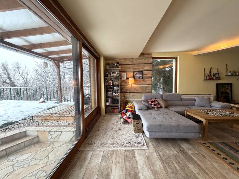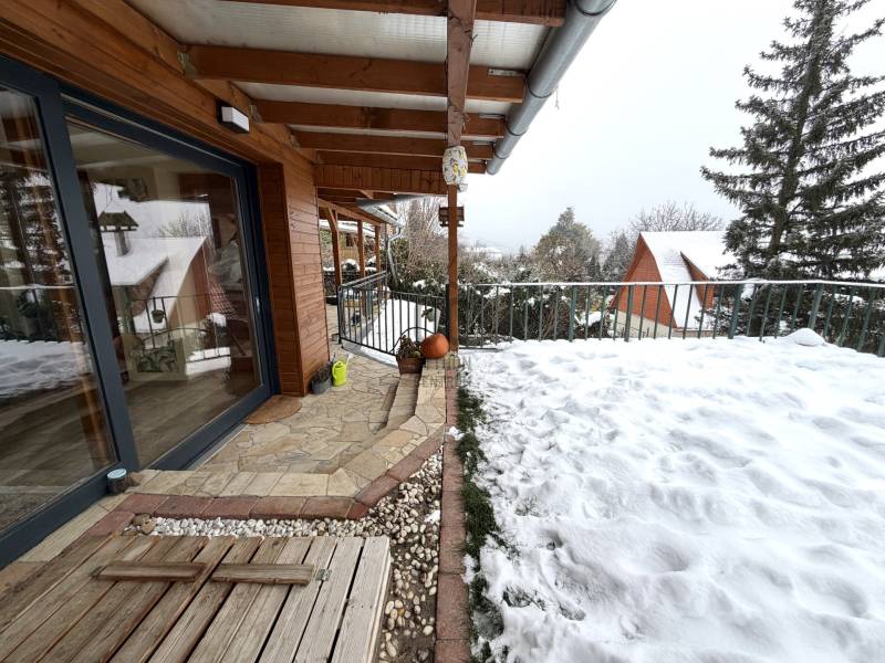 Ritka lehetőség a piacon: állandó panoráma, teljes nyugalom, mégis mindössze 15 percre Budapesttől!Ez a 150nm-es világos, tágas otthon Budakeszi legszebb részén helyezkedik el, ahol sem autóforgalom, sem szomszédzaj nem zavarja a mindennapokat.Otthon, ahol egész nap süt a nap.A nappali, a terasz és a hálószobák egész nap természetes fényben fürdenek.A 60 nm-es terasz egy része füvesített, automata öntözőrendszerrel felszerelt, igény esetén jakuzzi is telepíthető, így saját privát wellness-szigeted lehet.Ősztől tavaszig a teraszról és a nappaliból páratlan naplementékben gyönyörködhetsz.Környezet és közlekedés:A környék csendes, zöldövezeti, igazi kis sziget a város mellett.A buszmegálló 5 perc sétára található, a Budapest-bérlettel használható járatok 5 percenként közlekednek, így a főváros gyorsan és kényelmesen elérhető, dugóállás nélkül, mindkét irányban.Műszaki állapot:•A ház 2007-ben társasházzá nyilvánított, 2019-ben teljes felújításon és 12 cm-es szigetelésen esett át•Szintek teljesen elszeparáltak, saját bejárattal és külön helyrajzi számmal•A telek adottsága miatt a szomszédokkal gyakorlatilag nem lehet találkozni•Fa, dupla üvegű nyílászárók•Viessmann kondenzációs kazán•Alacsony rezsi: fűtés ~15.800 Ft/hó, áram ~5.700 Ft/hóKert és parkolás:•A lakáshoz kb. 200 nm saját kert tartozik•Emellett 702 nm közös, gondozott kert is rendelkezésre áll, gyümölcsfákkal, virágokkal, sütögető hellyel•Ingyenes utcai parkolás, saját beállón•Extra: 1 év ingyenes parkolóhely a pár perc sétára található teremgarázsban (a vételár része!)Infrastruktúra:•DM, Coop, pékség, éttermek, park és játszótér (10 perc séta)•Két irányban 5 perc alatt cukrászdák, kávézók•Kiváló óvodák, iskolák (állami és magán), erdei és parki játszóterek•Közeli védőnői, gyermekorvosi és felnőtt orvosi központ•Kedves, összetartó, segítőkész lakóközösségKinek ajánljuk?Tökéletes választás:✔ családoknak✔ külföldről hazatelepülőknek✔ befektetőknekakik exkluzív, panorámás, nyugodt otthont keresnek közel Budapesthez.Gyors 30 napos birtokbaadás! Rugalmasan megtekinthető, további információért és megtekintési időpontért hívjon!