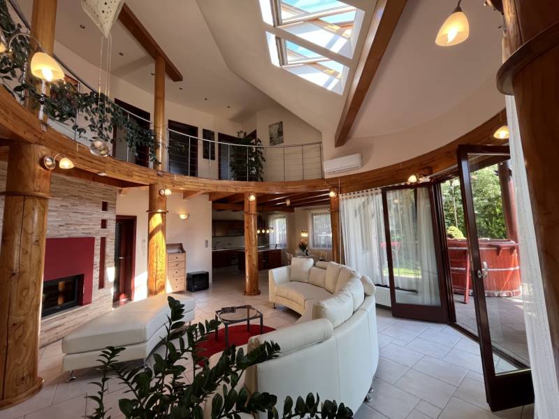 Exkluzív családi ház Veresegyház legszebb, zöldövezeti részén!Nyugodt, természetközeli környezetben kínálunk megvételre egy magas műszaki tartalommal, kifinomult ízléssel megépített prémium családi otthont, amely a tágas élettereket, az időtálló minőséget és a privát életstílust helyezi előtérbe.Reprezentatív terek & elegáns arányok:• 297 m² gondosan megtervezett lakótér• 6 méteres belmagasságú, különleges kivitelezésű, galériás nappali, kandallóval• nagyvonalú amerikai konyha kényelmes étkezővel• többfunkciós tetőtéri szint – hatalmas dolgozószoba, hálószobák, vendégtér vagy privát lakrész kialakításáraA belső terek tágas és harmonikus arányai, valamint a természetes fény jelenléte jellemzi az egész épületet.Prémium anyaghasználat & beépített megoldások:• porotherm téglából épült, szigetelt ház• különleges, fa oszlopos tartószerkezetek• számos egyedileg tervezett beépített bútor• diszkréten integrált tárolómegoldások• minőségi kivitelezés, időtálló részletekPrivát kert & kültéri luxus:• 800 m²-es, parkosított, intim kert• automata öntözőrendszer kiépítve• 60 m²-es DNy-i tájolású, fedett terasz, székely dézsával• két különálló faház - egy kisebb és egy nagyobb tároló• tökéletes helyszín pihenéshez, családi eseményekhez, vendéglátáshozKényelmes parkolás & praktikum:• garázs• fedett autóbeálló• bőséges tárolási lehetőségek a telken és az épületen belül isKorszerű technológia & fenntartható komfort:• padlófűtés kondenzációs kazánról, radiátorokkal kiegészítve• alternatív megoldások: kandalló, ionkazán• napelemek, napkollektor, klímaberendezések• víz kezelő rendszer, riasztó• energiahatékony, tudatosan kialakított gépészetKitűnő lokáció – természet és elérhetőség egyensúlya:• Csendes, zöldövezeti környezet• Budapest gyorsan és kényelmesen elérhető• Ideális külföldi vásárlók számára is, akik értékelik a repülőtér közelségét és a prémium életstílustEz az otthon azok számára készült, akik nem kompromisszumokban, hanem életminőségben gondolkodnak.