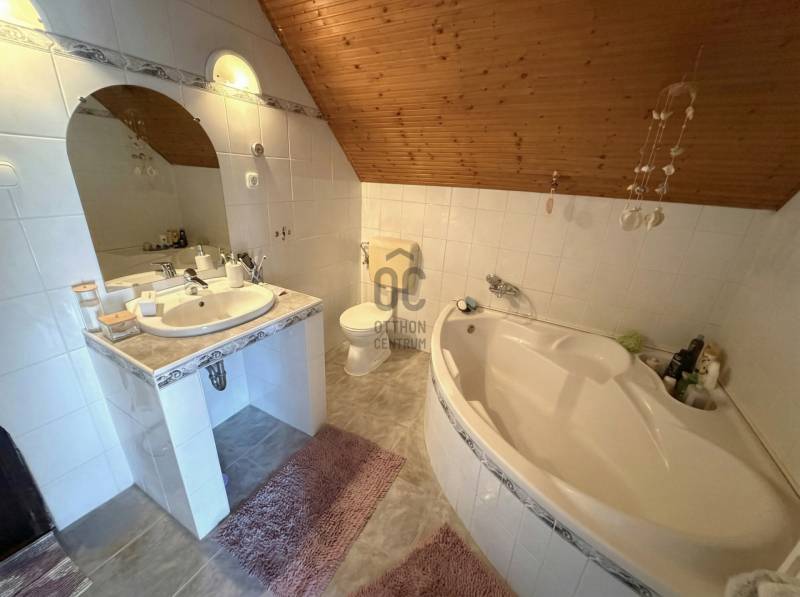 Nagytarcsán csendes mellékutcában kínálunk megvásárlása egy 796 nm-es összközműves telken álló alápincézett+ két lakószintes önálló családi házat. A földszinten a fedett teraszról nyílik a bejárat, ahol a tágas, csupa napfény nappali (kelet-délkeleti tájolású), kényelmes méretű étkező, konyha, kamra, egy nagy hálószoba, fürdőszoba és egy külön mellékhelyiség került kialakításra. Modern, mai igényeknek megfelelő belső elosztás, tágas, rendkívül világos helyiségek. Az emeletre kényelmes lépcső vezet, ahol két nagy hálószoba (egyik teraszos), és egy nagy kádas fürdőszoba kapott helyet. A fürdőszoba a két hálószoba között helyezkedik el, mindkét szobából közvetlenül megközelíthető. A lakóépület alatt több helyiségből álló nagy szuterén található, itt garázs, kazánház, tárolók vannak, a lakásba a belső lépcsőn juthatunk fel. A ház 2000-ben nyerte el mai formáját, ekkor lett bővítve a tetőtérrel. A nyílászárók cserélve lettek korszerű műanyag ablakokra redőnyökkel és szúnyoghálóval felszerelve, a fűtést egy korszerű turbós kombi cirkó biztosítja, de rendelkezésre áll egy szinte új vegyes tüzelésű kazán is. A tetőt beton cserép fedi, a kertben 3 autó számára fedett beálló lett kialakítva. A környék csendes, csupa zöld, buszmegálló, bevásárlási lehetőség pár perces sétával elérhető.