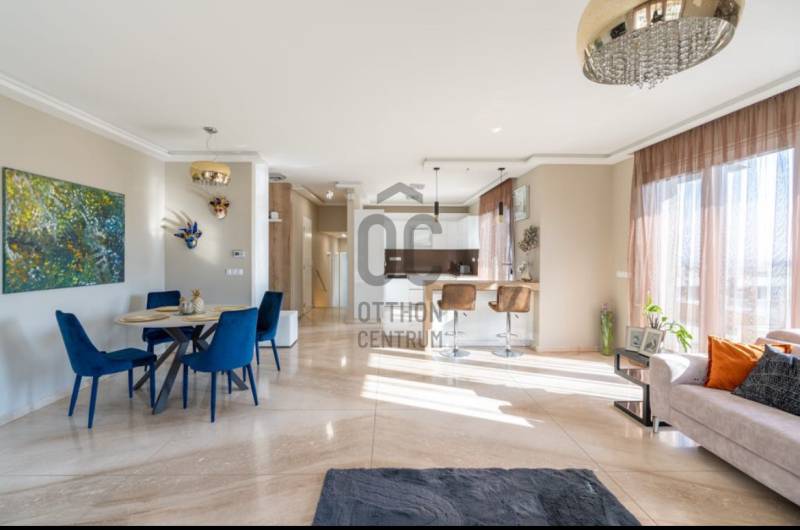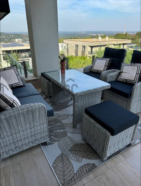 RITKA BUDAI ÉLMÉNY KOMPROMISSZUMOK NÉLKÜL- Panoráma, ami minden napszakban új arcát mutatjaRÖVID ÖSSZEFOGLALÓHarsánylejtő egyik legkülönlegesebb pontján, egy elegáns, mindössze öt lakásos társasházban kínáljuk megvételre ezt a kivételes adottságú, panorámás otthont, amely a budai zöldövezet nyugalmát a modern luxus kifinomultságával ötvözi. A lakás nemcsak elhelyezkedésével, hanem térszervezésével és műszaki tartalmával is a felső kategóriát képviseli.LOKÁCIÓA környék csendes, zöldövezeti hangulata ideális egy nyugodt, mégis aktív városi élethez. Az infrastruktúra kiváló: nemzetközi és hazai iskolák, sport- és szabadidős lehetőségek, bevásárlóközpontok mind néhány percen belül elérhetők. Az Árpád híd, a Margit híd és a belváros autóval mindössze 10 perc, így a természetközeli környezet nem jelent elszigeteltséget.Az utca különösen ritka adottságú: csendes, átmenő forgalomtól mentes zsák utca, ahol a lejtős fekvés miatt a legtöbb ingatlan panorámás, miközben megmarad az intimitás és a zöld környezet dominanciája. Az itt található ingatlanok ritkán kerülnek piacra, hosszú távon is értékállók.AZ ÚJ OTTHONODA nettó 110 m²-es lakás szíve a közel 50 m²-es nappali–étkező–konyha, ahol az impozáns belmagasság és a nagyméretű üvegfelületek páratlan térérzetet és természetes fényt biztosítanak. Ez a tér ideális a mindennapokhoz és a vendégfogadáshoz egyaránt, miközben a panoráma folyamatos vizuális élményt nyújt.A gondosan átgondolt alaprajz három különálló, tágas hálószobát kínál, amelyek nyugalmat és privát teret biztosítanak. A lakásban egy kádas-zuhanyzós fürdőszoba is helyet kapott, a praktikus közlekedők pedig logikusan fűzik fel az egyes helyiségeket.A belső terek természetes módon kapcsolódnak a pergolás, tágas teraszhoz és a két külön kijáratos erkélyhez, ahonnan zavartalan budai panoráma tárul elénk – reggeltől estig változó fényekkel, évszakonként új hangulattal.Az ingatlanhoz két fedett garázshely, egy fűtött felszíni parkoló, valamint egy saját 15m2-es tároló tartozik, amelyek együttesen, kötelezően megvásárolandóak 20 millió forintért.MŰSZAKI JELLEMZŐKA legmagasabb szintű műszaki megoldásokkal felszerelve. Okosotthon rendszer, hőszivattyú, mennyezeti hűtés-fűtés, padlófűtés, levegőkeringető rendszer, elektromos redőnyök, szúnyoghálók és riasztó gondoskodnak a kényelemről, az energiahatékonyságról és a biztonságról.FUN FACTHarsánylejtő mikroklímája kimutathatóan kedvezőbb, mint Budapest belső részein: a domboldali fekvés miatt jobb a légmozgás, páratlan a panoráma, alacsonyabb a nyári hőterhelés, és a levegő minősége is tisztább. Ez az otthon nem csupán egy ingatlan, hanem egy tudatos döntés a panorámás budai életminőség mellett. Ha valóban különlegeset keres, ne halogassa – egyeztessen személyes bemutatót, és tapasztalja meg, mit jelent itt élni.