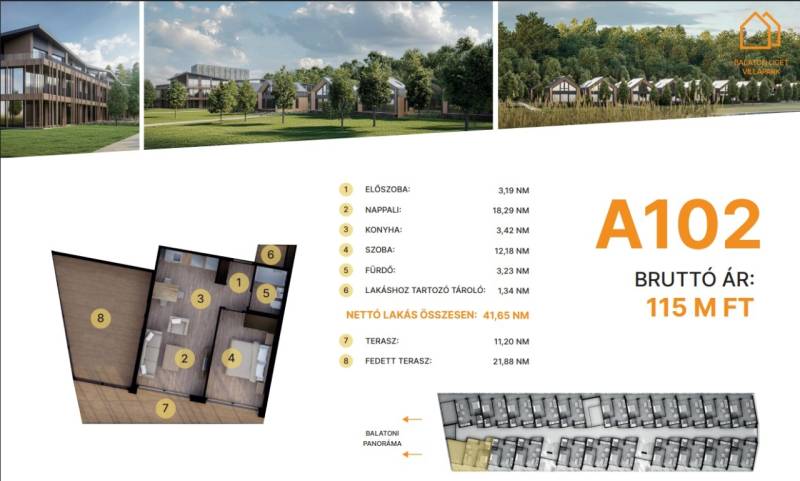 Balatonföldvár: Balatonföldvár fontos turisztikai célpont, nemcsak a magyarok, hanem más európai országok turistái számára is, természeti szépségei (például a löszhegy és a nagy virágos parkok), továbbá történelmi örökségei (például a kelta ösvény, a régi kúriák és villák) miatt számtalan szabadidős lehetőséget, valamint számos vízi sportot (vitorlázás, szörfözés, horgászat, evezés)Balaton liget willapark:Lakások száma: 56 db.Alapterület: 28-56 m².A földszinti lakásokhoz saját, privát kert tartozik.A földszinten 21 lakás található, 48–110 m² közötti alapterülettel.Az első emeleten további 21 lakás érhető el, 47–75 m² közötti méretben.A második emeleten 17 lakás kapott helyet.A lakásokhoz önálló tárolóhelyiségek tartoznak, amelyek a közös folyosóról közelíthetők meg.Környezettudatos építő anyagokA+ energetikai besorolásFelszíni parkoló: 6.350.000. Ft.Modern letisztult építészet, tömegformálás, Balatonra tájolt panorámás teraszok.Apartmanlakás - alapfelszereltség:100% tömör CLT Ausztriából.20 cm kőzetgyapot hőszigetelés.Fa hőszigetelő nyílászárók 3 rétegű üvegezéssel,tölgyfurnér melegburkolat.Porcelán greslap hidegburkolat, villeroy fürdőszoba szaniterekpadlófűtés.Levegős hőszivattyú (VRV splitklíma), 50kW társasházi napelemrendszer, elektromos redőny, szúnyogháló beépített bútoroksaját terasz.A 102. lakás.A további kérdésekkel és a megtekintéssel kapcsolatban kérem keressen a megadott mobil számon.