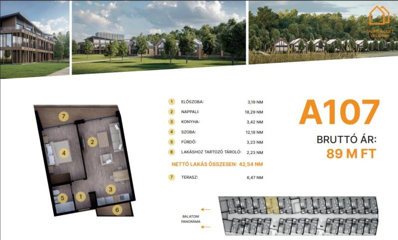 Balatonföldvár: Balatonföldvár fontos turisztikai célpont, nemcsak a magyarok, hanem más európai országok turistái számára is, természeti szépségei (például a löszhegy és a nagy virágos parkok), továbbá történelmi örökségei (például a kelta ösvény, a régi kúriák és villák) miatt számtalan szabadidős lehetőséget, valamint számos vízi sportot (vitorlázás, szörfözés, horgászat, evezés)Balaton liget willapark:Lakások száma: 56 db.Alapterület: 28-56 m².A földszinti lakásokhoz saját, privát kert tartozik.A földszinten 21 lakás található, 48–110 m² közötti alapterülettel.Az első emeleten további 21 lakás érhető el, 47–75 m² közötti méretben.A második emeleten 17 lakás kapott helyet.A lakásokhoz önálló tárolóhelyiségek tartoznak, amelyek a közös folyosóról közelíthetők meg.Környezettudatos építő anyagokA+ energetikai besorolásFelszíni parkoló: 6.350.000. Ft.Modern letisztult építészet, tömegformálás, Balatonra tájolt panorámás teraszok.Apartmanlakás - alapfelszereltség:100% tömör CLT Ausztriából.20 cm kőzetgyapot hőszigetelés.Fa hőszigetelő nyílászárók 3 rétegű üvegezéssel,tölgyfurnér melegburkolat.Porcelán greslap hidegburkolat, villeroy fürdőszoba szaniterekpadlófűtés.Levegős hőszivattyú (VRV splitklíma), 50kW társasházi napelemrendszer, elektromos redőny, szúnyogháló beépített bútoroksaját terasz.A 107. lakás.A további kérdésekkel és a megtekintéssel kapcsolatban kérem keressen a megadott mobil számon.