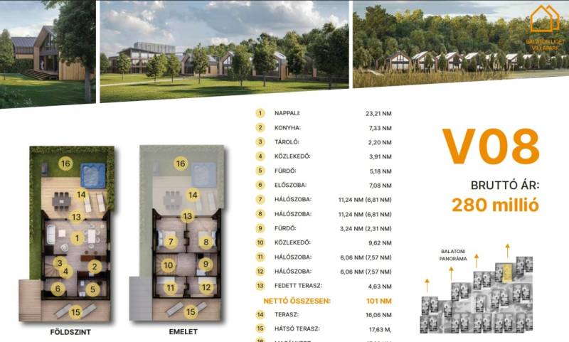 Balatonföldvár: Balatonföldvár fontos turisztikai célpont, nemcsak a magyarok, hanem más európai országok turistái számára is, természeti szépségei (például a löszhegy és a nagy virágos parkok), továbbá történelmi örökségei (például a kelta ösvény, a régi kúriák és villák) miatt számtalan szabadidős lehetőséget, valamint számos vízi sportot (vitorlázás, szörfözés, horgászat, evezés)Villák - kulcsrakész alapfelszereltség:100% tömör CLT Ausztriából.20 cm kőzetgyapot hőszigetelés.A+ energetikai besorolás.Fa hőszigetelő nyílászárók 3 rétegű üvegezéssel, tölgyfurnér melegburkolat.Porcelán greslap hidegburkolat.Villeroy fürdőszoba szaniterek,padlófűtés.Levegős hőszivattyú (VRV splitklíma), 2,5 kW napelem rendszer, elektromos redőny, szúnyogháló, beépített bútorok, homlokzati díszvilágítás.min. 35 m² teraszmin. 47 m² magánkert.Villák - választható opciók:Prémium konyhabútor konyhaszigettel, okosotthon rendszer, szauna (épületen belül), látvány design kandalló, 4 személyes prémium jacuzzi, gázos grillsütő.Privát zárt parkoló: 6.350.000. Ft.Privát elektromos autótöltő, kedvezményes hajóhely az új e-kikötőben.V. 08.A további kérdésekkel és a megtekintéssel kapcsolatban kérem keressen a megadott mobil számon.