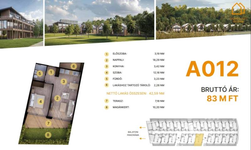 Balatonföldvár: Balatonföldvár fontos turisztikai célpont, nemcsak a magyarok, hanem más európai országok turistái számára is, természeti szépségei (például a löszhegy és a nagy virágos parkok), továbbá történelmi örökségei (például a kelta ösvény, a régi kúriák és villák) miatt számtalan szabadidős lehetőséget, valamint számos vízi sportot (vitorlázás, szörfözés, horgászat, evezés)Balaton liget willapark:Lakások száma: 56 db.Alapterület: 28-56 m².A földszinti lakásokhoz saját, privát kert tartozik.A földszinten 21 lakás található, 48–110 m² közötti alapterülettel.Az első emeleten további 21 lakás érhető el, 47–75 m² közötti méretben.A második emeleten 17 lakás kapott helyet.A lakásokhoz önálló tárolóhelyiségek tartoznak, amelyek a közös folyosóról közelíthetők meg.Környezettudatos építő anyagokA+ energetikai besorolásFelszíni parkoló: 6.350.000. Ft.Modern letisztult építészet, tömegformálás, Balatonra tájolt panorámás teraszok.Apartmanlakás - alapfelszereltség:100% tömör CLT Ausztriából.20 cm kőzetgyapot hőszigetelés.Fa hőszigetelő nyílászárók 3 rétegű üvegezéssel,tölgyfurnér melegburkolat.Porcelán greslap hidegburkolat, villeroy fürdőszoba szaniterekpadlófűtés.Levegős hőszivattyú (VRV splitklíma), 50kW társasházi napelemrendszer, elektromos redőny, szúnyogháló beépített bútoroksaját teraszKert: 10 nmA 012.. lakás.A további kérdésekkel és a megtekintéssel kapcsolatban kérem keressen a megadott mobil számon.