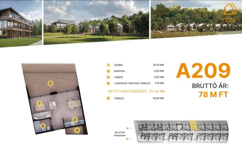 Balatonföldvár: Balatonföldvár fontos turisztikai célpont, nemcsak a magyarok, hanem más európai országok turistái számára is, természeti szépségei (például a löszhegy és a nagy virágos parkok), továbbá történelmi örökségei (például a kelta ösvény, a régi kúriák és villák) miatt számtalan szabadidős lehetőséget, valamint számos vízi sportot (vitorlázás, szörfözés, horgászat, evezés)Balaton liget willapark:Lakások száma: 56 db.Alapterület: 28-56 m².A földszinti lakásokhoz saját, privát kert tartozik.A földszinten 21 lakás található, 48–110 m² közötti alapterülettel.Az első emeleten további 21 lakás érhető el, 47–75 m² közötti méretben.A második emeleten 17 lakás kapott helyet.A lakásokhoz önálló tárolóhelyiségek tartoznak, amelyek a közös folyosóról közelíthetők meg.Környezettudatos építő anyagokA+ energetikai besorolásFelszíni parkoló: 6.350.000. Ft.Modern letisztult építészet, tömegformálás, Balatonra tájolt panorámás teraszok.Apartmanlakás - alapfelszereltség:100% tömör CLT Ausztriából.20 cm kőzetgyapot hőszigetelés.Fa hőszigetelő nyílászárók 3 rétegű üvegezéssel,tölgyfurnér melegburkolat.Porcelán greslap hidegburkolat, villeroy fürdőszoba szaniterekpadlófűtés.Levegős hőszivattyú (VRV splitklíma), 50kW társasházi napelemrendszer, elektromos redőny, szúnyogháló beépített bútoroksaját terasz.A 209. lakás.A további kérdésekkel és a megtekintéssel kapcsolatban kérem keressen a megadott mobil számon.