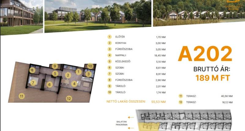 Balatonföldvár: Balatonföldvár fontos turisztikai célpont, nemcsak a magyarok, hanem más európai országok turistái számára is, természeti szépségei (például a löszhegy és a nagy virágos parkok), továbbá történelmi örökségei (például a kelta ösvény, a régi kúriák és villák) miatt számtalan szabadidős lehetőséget, valamint számos vízi sportot (vitorlázás, szörfözés, horgászat, evezés)Balaton liget willapark:Lakások száma: 56 db.Alapterület: 28-56 m².A földszinti lakásokhoz saját, privát kert tartozik.A földszinten 21 lakás található, 48–110 m² közötti alapterülettel.Az első emeleten további 21 lakás érhető el, 47–75 m² közötti méretben.A második emeleten 17 lakás kapott helyet.A lakásokhoz önálló tárolóhelyiségek tartoznak, amelyek a közös folyosóról közelíthetők meg.Környezettudatos építő anyagokA+ energetikai besorolásFelszíni parkoló: 6.350.000. Ft.Modern letisztult építészet, tömegformálás, Balatonra tájolt panorámás teraszok.Apartmanlakás - alapfelszereltség:100% tömör CLT Ausztriából.20 cm kőzetgyapot hőszigetelés.Fa hőszigetelő nyílászárók 3 rétegű üvegezéssel,tölgyfurnér melegburkolat.Porcelán greslap hidegburkolat, villeroy fürdőszoba szaniterekpadlófűtés.Levegős hőszivattyú (VRV splitklíma), 50kW társasházi napelemrendszer, elektromos redőny, szúnyogháló beépített bútoroksaját terasz.A 202. lakás.A további kérdésekkel és a megtekintéssel kapcsolatban kérem keressen a megadott mobil számon.