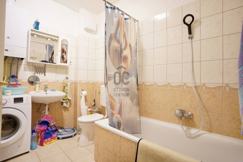 Budapest XVIII. kerületében, Újpéteritelepen, a Nemes utcában rendezett társasházban kínálunk megvételre egy 49 m²-es, 2 külön nyíló szobás, utcára és belső udvarra is néző, világos és jó elosztású első emeleti lakást,melyhez tarozik egy felszíni zárt udvari autó beálló amely plusz 2,5 millió forintét megvásárolandó.A ház 2003-ban épült, tégla szerkezetű, jó állapotú épület, mindössze 18 lakással. A társasház földszintjén üzletek találhatók – többek között pékség, virágbolt, dohánybolt és egy Otthon Centrum iroda is –, így minden fontos szolgáltatás karnyújtásnyira elérhető.A első emeleten található lakás tehermentes, hitelezhető.Az ingatlanban jelenleg megbízható bérlő lakik több éve , aki igény esetén szívesen maradna is, így kiváló lehetőség ez befektetés szempontjából. Amennyiben saját célra vásárolná meg az lakást a bérlő 60-90 napon belül tud kiköltözni. A házban több 2-3 szobás lakás is van még eladó.A lakás helyiségei:-nappali-étkező: 18,28 m²-konyha: 8,29 m²-külön nyíló hálószoba: 11,13 m² -előszoba: 5,82 m²-fürdőszoba-WC: 5,8 m²A fűtésről 2017-ben cserélt, kondenzációs gázcirkó gondoskodik, amelynek idei nagy karbantartása már megtörtént. A lakásban klíma is található, valamint műanyag nyílászárók kerültek beépítésre.A villany- és gázórák feltöltőkártyás rendszerűek, a közös költség 16 170 Ft/hó.A lakáshoz zárható közös tároló is tartozik, a lépcsőház földszintjénParkolás az utcán ingyenes. De a lakáshoz kötelezően megvásárlandó egy felszíni udvari beálló melyek ára 2,5 millió forint. A környék csendes, rendezett és biztonságos.A közlekedés kiváló: néhány perc sétával elérhető több buszjárat, amelyekkel gyorsan megközelíthető a Kőbánya-Kispest metróvégállomás és a belváros is. Autóval az Üllői út közelsége révén a reptér és az M0-ás is könnyen elérhető.Ha egy kiváló elhelyezkedésű, jól karbantartott, azonnal költözhető lakást keres a XVIII. kerületben, ez a lehetőség Önnek szól.Amennyiben bármilyen kérdés felmerült Önben vagy szeretné megtekinteni az ingatlant keressen bizalommal. Továbbá igény esetén a vásárlás teljes folyamata során magas szintű, szakmailag releváns hitelügyintézői támogatást biztosítunk, a finanszírozási lehetőségek áttekintésétől egészen a sikeres folyósításig.Ez az ingatlan a \"Felező csomag\" megbízási portfólióhoz tartozik. Részletek az Otthon Centrum weboldalán.