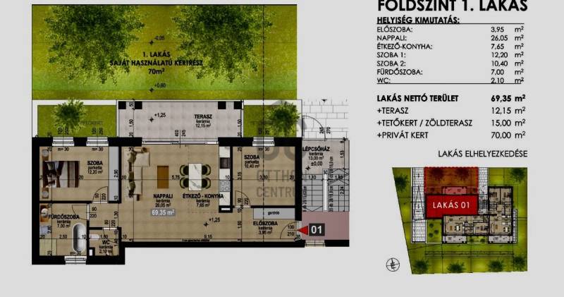 Debrecen egyik legkedveltebb és legértékállóbb városrészén, a Nagyerdő lábánál, eladásra kínálok egy 6 lakásos, modern társasházat, amely a minőséget, a letisztult eleganciát és magas műszaki tartalmat képvisel.Az ingatlan prémium kivitelezéssel, korszerű műszaki megoldásokkal és átgondolt tervekkel készül.A társasház nyugodt, csendes környezetben helyezkedik el, mégis kiváló infrastrukturával a Nagyerdő közelsége különleges életérzést biztosít.A földszinti lakások egyedi arculata a tágas nappali, melyet a teraszra nyíló hatalmas hőszigetelt nagy ablak borítja, így a természet mindig karnyújtásnyira van.A társasház főbb jellemzői:- Az épület három szintre tagolható: pinceszint + földszint + emeleti szint- A pinceszinten 6 db. gépkocsi beálló valamint önálló tárolóhelyiségek található- Az épületben szintenként 3-3 kiválóan berendezhető lakás helyezkedik el- A lakásokhoz loggiák és teraszok kapcsolódnak- Csendes kertvárosias környezet- Parkosított zöld felületek a telkenLakások kialakítása:- Földszinti lakásokhoz saját kert, zöld terasz és fedett terasz tartozi.- Emeleti lakásokhoz loggiák tartoznak.Földszint 1 lakás: 69.3 nm + 12.15 nm terasz + 15 nm zöld terasz + 70 nm privát kertFöldszint 2 lakás: 57.65 nm + 12.15 nm terasz + 39.8 nm zöld terasz + 167 nm privát kertFöldszint 3 lakás: 69.75 nm + 12.15 nm terasz + 177 nm privát kertEmeleti lakások:Emelet 4 lakás: 69.35 nm + 11.35 nm loggiaEmelet 5 lakás: 57.65 nm + 11.35 nm loggiaEmelet 6 lakás: 69.75 nm + 11.35 nm loggiaMűszaki tartalom:- Prémium minőségű Pannontherm ALU-FA nyílászárók, extra nagyméretű emelő-toló erkélyajtókkal és üvegfelületekkel- Pannontherm - Stemeseder prémium Zsaluzia árnyékolás a nyílászárókkal harmonizáló színben- 3 rétegű hőszigetelt üvegezés- 20 cm vastagságú homlokzati szigetelés- Fan-coll hőszivattyús hűtés- Padlófűtéses hőleadás a lakás minden helyiségében- Levegő-víz hőszivattyús fűtés rendszer- Prémium anyaghasználatAz ingatlanokhoz tartozik gépkocsi beálló és tároló, melynek megvásárlása kötelező.A lakások CSOK Pluszra és hitelre alkalmasak.Amennyiben az ingatlan felkeltette érdeklődését, kérdése van, vagy szeretné megtekinteni, hétvégén is szívesen fogadom hívását!