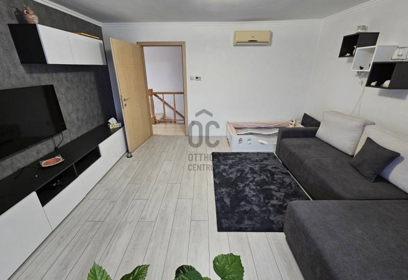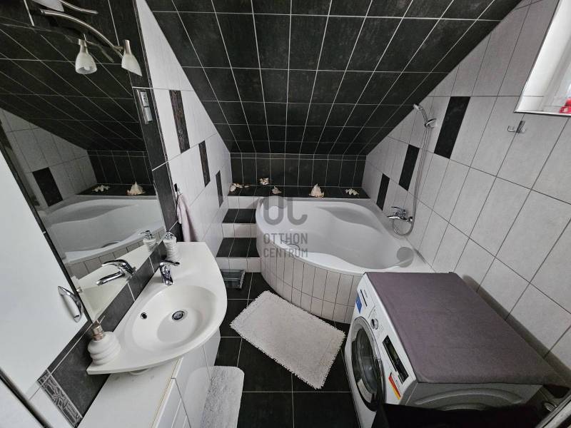Debrecen Szabadságtelepének csendes, kertvárosi részén, a Vámospércsi útból nyíló, aszfaltozott utcában eladó egy háromszintes ikerház, amely ideális választás azoknak a családoknak, akik nyugodt környezetben, mégis jó infrastruktúrával szeretnének élni.Az ingatlan 450 m²-es telken helyezkedik el, nettó 132 m² lakótérrel, valamint egy 71 m²-es, jól kihasználható pinceszinttel.A házba belépve egy világos, tágas nappali–konyha–étkező tér fogad, amely a családi élet központja lehet.Innen nyílik egy 10 m²-es fedett terasz, ahol a reggeli kávé vagy az esti beszélgetések igazán kellemesek.A konyha minőségi beépített bútorokkal és gépekkel, gránit munkapulttal készült, az étkezőnél bőven van hely a közös étkezésekhez.A földszinten található:-Épített zuhanyzós fürdőszoba WC-vel-Ajtóval leválasztott, praktikus előszoba beépített tárolókkal-Padlófűtés, amely kellemes meleget biztosít a hidegebb napokonFelújítások – amik a mindennapokat teszik kényelmesebbé:-Korszerűsített fűtésrendszer, padlófűtéssel a földszinten és radiátoros fűtéssel a tetőtérben-Fürdőszobák és földszint minőségi burkolatainak cseréje-Laminált burkolatok cseréje a szobákbanA tetőtérben található:-Három külön nyíló, világos hálószoba , ahol minden családtagnak jut saját tér-A két szobából nyíló loggia csendes pihenést kínál-Sarokkádas fürdőszoba és külön WC pedig segíti a reggeli készülődéstSokoldalúan használható pinceszint:-Kétállásos garázs-Kazánház és kamra-Külön WC és zuhanyzó-Tökéletes tárolásra, hobbira vagy akár kisebb műhelynek is.Gondozott kert, biztonságos környezet:A füvesített, körbekerített kert automata öntözőrendszerrel ellátott, így könnyen karbantartható.Az automata kaputechnika és a térkövezett kerítés előtti parkoló a mindennapi kényelmet szolgálja.Elhelyezkedés, amit a család is szeretni fog:-Iskola, óvoda a közelben-Gyógyszertár, üzletek könnyen elérhetők-Lidl, Aldi, Penny néhány percre-Csendes, folyamatosan fejlődő városrészEz az ingatlan felújított, jól élhető családi otthon, ahol a tágas terek, a kert és a nyugodt környezet valódi életminőséget ad. Ha olyan otthont keres, ahová jó hazatérni, hívjon bizalommal, és tekintse meg személyesen!Az alaprajz tájékoztató jellegű.Az ingatlan \"Felező díjcsomagban\" lett megkötve, kérem az Otthon Centrum oldalán tájékozódjon a részletekről!Ez az ingatlan a \"Felező csomag\" megbízási portfólióhoz tartozik. Részletek az Otthon Centrum weboldalán.