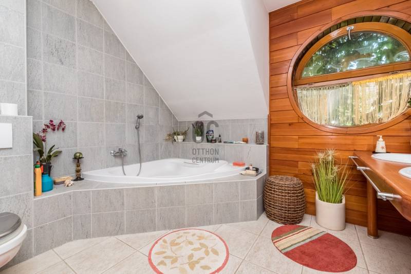 Csobánka történelmi települése a smaragd az északi agglomeráció koronáján. A pilis lábánál elterülő falusias bájú községet háborítatlan zöld öleli, sziklás és erdős hegylánctól körülvett gyönyörű völgykatlanban fekszik mindössze 15km-re Budapesttől!Tökéletes választás azok számára, akik a Fővároshoz kötve élnek, de nem kötnek abban kompromisszumot, hogy az Otthonuk a nyugalom szigete legyen!Itt, a Villa-negyedben került eladósorba egy UNIKÁLIS CSALÁDI HÁZ.Abszolút egyedi tervek, falakból megvalósított álmok születtek itt 1999-ben, melyet mi sem bizonyít jobban, hogy ekkor az épület megkapta az \"ÉV HÁZA\" díjat, valamint a Magyar Építészeti Kamara különdíjazottja lett.Domboldalba rejtett álomotthon ami tökéletes kompozíciója a romantikus Provence otthonnak és a kényelmes életterek alkotta funkciónak.A közel 1000m2-es hegyoldali telket tökéletesen kihasználva mind az építész mind a tájépítész egyedit alkotott. Az utcafronti terméskövezett támfalba rejtve 60m2-es 3állásos garázs valamint biciklitároló került. A ház 2 szintes elrendezésű, 203nettó alapterületén 2 külön, és egyben is használható lakótér valósult meg:Földszinten: elegáns előszoba/hall, mosókonyha-gépészeti helyiség, szeparált illemhely, hatalmas amerikai konyhás nappali kamrával, valamint térben szeparált dolgozószoba kaptak helyet. A nappali szinteltolással különül el, éke a frissen készült mázoskerámia cserépkályha és a hatalmas ablakokon át nyíló zavartalan zöldkerti panoráma. Erről a szintről elérhető a KÜLÖN LAKRÉSZ, -melynek külső bejárata is van, nappali+konyha+fürdőszoba elrendezésű így tökéletes választás nagyszülő elhelyezésére, fiatal felnőtt gyermek számára valamint ÜGYFÉLFOGADÁSRA, IRODAI TEVÉKENYSÉGRE, BEAUTY SZOLGÁLTATÁSOKRA, -így a vállalkozás együtt mégis szeparálva koordinálható otthonról!Emeleten: Fürdőszoba, 4 hálószoba, mind világos, kellemes méretű, az egyik walk-in gardróbbal felszerelt, 2-nek franciaerkélye van, a szülői lakrész pedig egy folyosó végén kialakított tágas hálószoba, saját fürdőszobával.Az elegáns terek jó műszaki felszereltséggel találkoznak, a házban PADLÓFŰTÉS van, KONDENZÁCIÓS KAZÁN biztosítja a hőszabályozást, a nyílászárók tömörfa-tokos thermoüveges egységek.Kiépített riasztórendszer, elektromos garázskapu, kerti tároló, víztisztító berendezés!A fenntartási költség ALACSONY, az épület hőtartása téli és nyári időszakban is tökéletes!A kert gyönyörű, buja díszcserjékkel, homlokzatra futó vadszőlővel kápráztatja el az ideérkezőt. Beállt, egészséges felnőtt növényzete nem csak dekorál, de árnyékot ad és levegőt szűr, így hatalmas érték annak, aki tudja mit ad a zöld az ember szívének!A növényzet gondozását automata öntözőrendszer segíti, a kerti szerszámoknak külön tároló áll rendelkezésre.Jöjjön el, tekintse meg, ha szereti a természetet és kívánja hogy a hétköznapjait körbeölelje a zöld, ha olyan otthont keres ahol a vállalkozása is elfér a család megzavarása nélkül, ha nagycsaládos és elege van a kompromisszumokból, - olyan otthonra vágyik ahol mindenkinek egészséges tér jut!Vigyázat! - ABSZOLÚT BELESZERETŐS, Ha megnézi nem keres majd tovább!-alaprajz feltöltése folyamatban, de mailben szívesen elküldöm!-