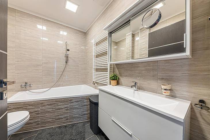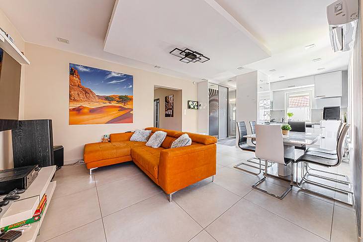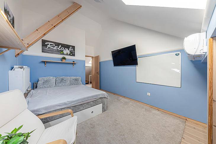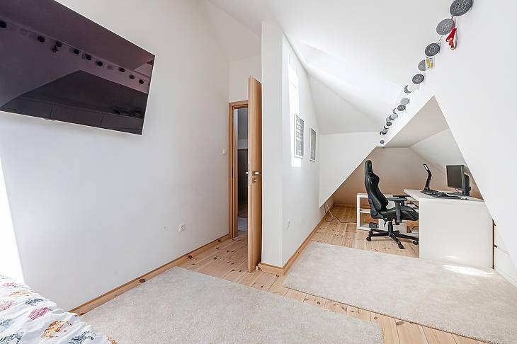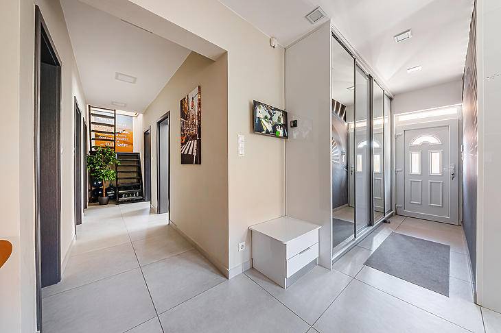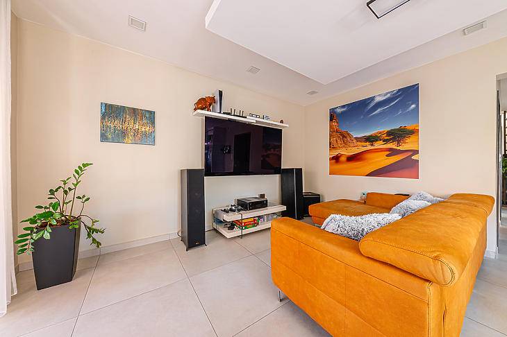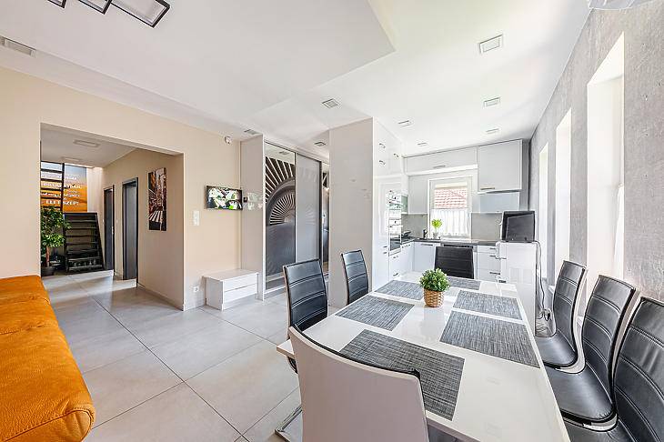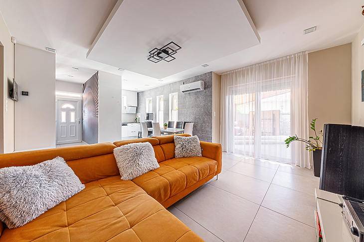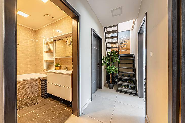 POMÁZON ELADÓ EGY ZÁRT LAKÓPARKI IKERHÁZ-FÉL!A KÖRNYÉK:Pomázon egy zárt lakóparkban, központi helyen, a H5-ös HÉV-től csak 12 perc sétára található. Könnyen megközelíthető rengeteg bevásárlási lehetőség, mint például a Lidl, vagy akár a SPAR szupermarket, melyek szintén 12 perc sétatávra helyezkednek el. A Mátyás Király Általános Iskola 15 perc, míg a Sashegyi Sándor Általános Iskola és Gimnázium 16 perc gyalog.A HÁZ JELLEMZŐI:-A ház hasznos alapterülete: 130 nm.-Plusz egy 22,73 nm-es beépített terasz, ahol klíma került kialakításra.-Plusz egy biciklitároló.-2018-ban épült, 30 cm vastagságú Porotherm téglából.-15 cm-es grafitos szigetelést kapott, melynek köszönhetően a rezsi rendkívül alacsony.-A tető Tondach Bolero terrakotta cseréppel fedett, 20 cm vtg. ISOVER üveggyapot hőszigeteléssel.-A nyílászárók 3 rétegűek, műanyagok.-Az egész házban vízlágyító rendszer került kialakításra.-Elektromos redőnyök és beépített szúnyogháló került kialakításra. -Megtalálható melegvíz tároló is, ami gázról és villanyról egyaránt működik, valamint meleg víz keringgető rendszer is ki lett alakítva.-A fűtésről egy Fondital Itaca 24 kW-os kondenzációs kazán gondoskodik.-A hidegburkolatok alatt padlófűtés, a szobákban radiátorok találhatóak.-Szinte minden helyiségben található klíma, a házban összesen 5 db.-Felszerelésre került 8 db 7 Kw-os napelem hálózat, ami még 8 évig szaldós.-Van energia tároló, ami 10,8 Kw-os, erről megy a kamerarendszer, riasztórendszer és az elektromos autótöltő.-Elektromos redőnyök és beépített szúnyogháló került kialakításra. -A kertben megtalálható egy kerti zuhany.-A telken belül kettő autó számára is van lehetőség a parkolásra.FINANSZÍROZÁS:Banki finanszírozással is megvásárolható, melyben irodánk ingyenes tanácsadással áll rendelkezésükre!VEVŐINK RÉSZÉRE A KÖZVETÍTÉS DÍJTALAN! A hirdetésben szereplő adatok tájékoztató jellegűek!