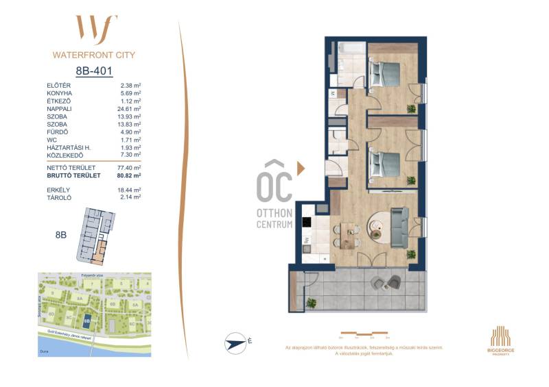 Projekt bemutatásaA projektrőlA Waterfront City egy új, modern városnegyed a 3. kerületben, ahol a természet közelsége és a városi kényelem tökéletes egyensúlyban van. A Duna-part közvetlen szomszédságában elhelyezkedő fejlesztés különleges atmoszférát kínál: a sétányt új épületek határolják, üzletekkel, kávézókkal és szolgáltatásokkal, amelyek élhető közösségi teret teremtenek.A 13 emeletes lakóépületből lenyűgöző örökpanoráma nyílik a budai hegyekre és a folyóra, a tágas teraszok pedig ideálisak a pihenéshez vagy a baráti összejövetelekhez. A zöldtetők, parkosított terek és fenntartható megoldások – mint az energiatakarékos rendszerek és okos otthon funkciók – mind hozzájárulnak a modern, környezettudatos életstílushoz.Látogass el értékesítési irodánkba, és tekintsd meg a városnegyed makettjét személyesen! Ismerd meg, milyen lesz az élet Budapest egyik legizgalmasabb új fejlesztésében!Óbuda szívébenKépzeld el, ahogy egy napsütéses délelőttön Óbuda szívében sétálsz, a Duna közelsége frissítően hat rád, miközben a Folyamőr utca, a Miklós tér és a Bogdáni út által határolt, öt hektáros területre érsz. A levegőben ott van a város történelme, mégis minden részletében a jövő hívogat.A 50 000 négyzetméteres területen egy hangulatos sétány vezet végig, amely egyenesen az óbudai Fő térre visz – mindössze 600 méterre. Ez a sétány nem csupán összeköt, hanem élményt nyújt: a Kolosy térről induló Óbudai Promenád részeként a város egyik legélhetőbb, legpezsgőbb szakaszán haladsz végig. És ha biciklivel érkeznél? A nemzetközi kerékpárút is itt halad el, Szentendre felé vezetve.Az 5. ütemben épülő 149 lakás mindegyike egyedi hangulatot kínál. Ahogy belépsz egy-egy otthonba, a hatalmas üvegfelületeken át beáradó fény és a tágas, szellős terek azonnal magukkal ragadnak. A kilátás? A Kaszap István park zöldje nyújt békét, míg a felsőbb emeletekről a Budai-hegység örökpanorámája tárul eléd – minden nap egy új festmény az ablakodban.A 6. ütemben 316 modern lakás épül, tágas teraszokkal és lenyűgöző kilátással a Dunára és a budai hegyekre. A lakók kényelmét őrszolgálat, kamerarendszer, mélygarázs, vendéglátóhelyek, belső park, játszótér és E-autó töltők szolgálják. Ez a projekt utolsó üteme, amely még közvetlen Duna-parti kapcsolattal rendelkezik.